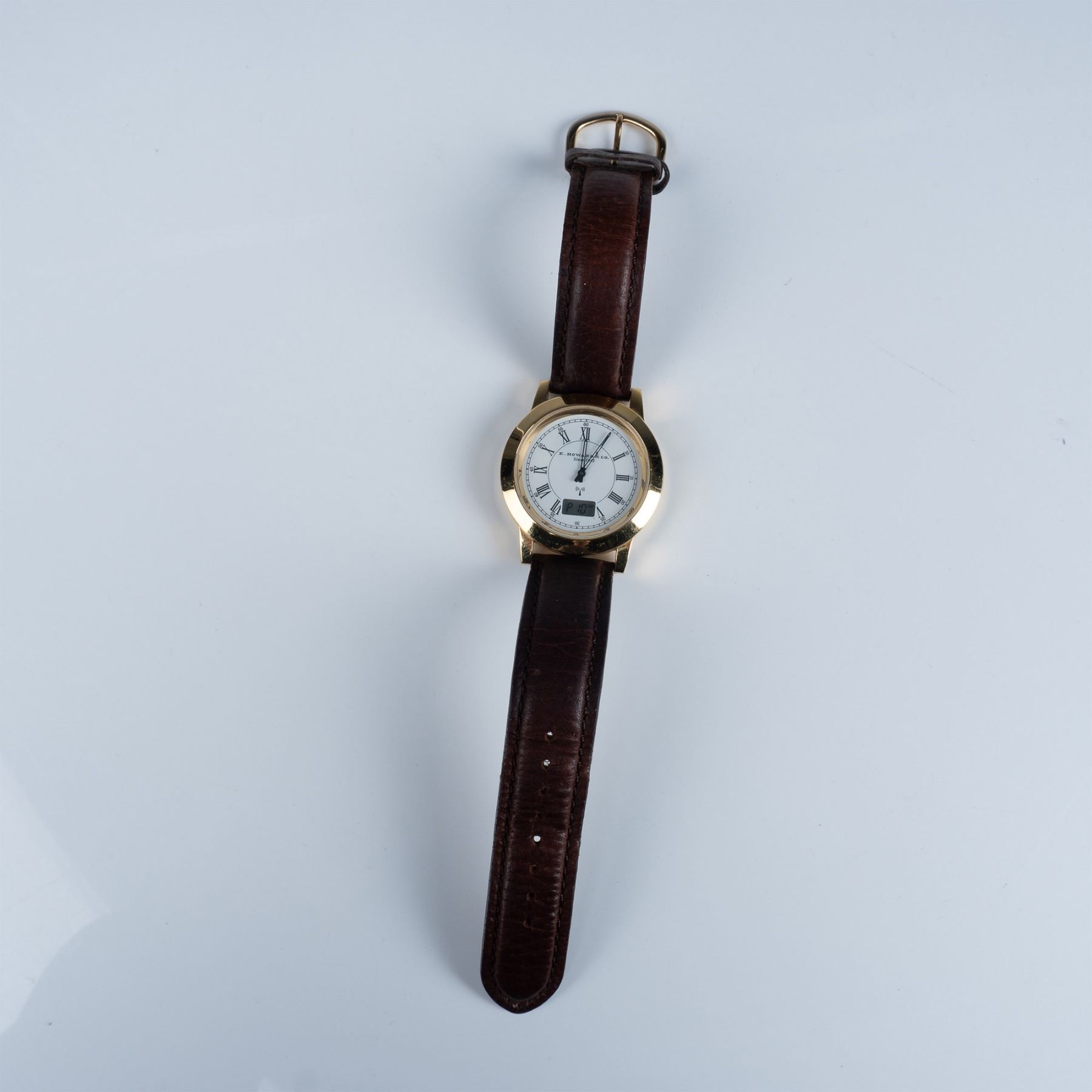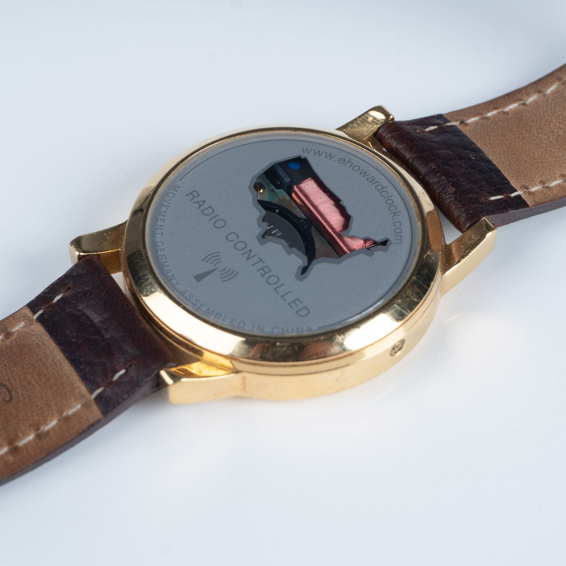 Unique technology that is Radio Controlled Time & Date Set automatically and adjust for Daylight Saving Time. Water Resistant up to 100 feet. White face with black Roman Numerals and digital date box at 6 o'clock position. Gold toned case with brown leather watch band. E. Howard & Co. backstamp on face.