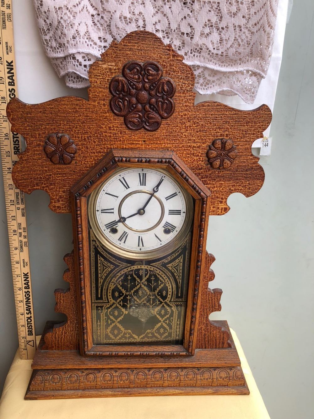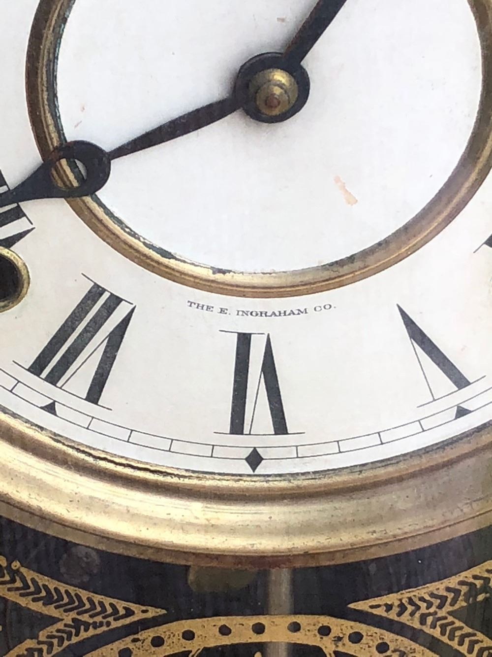 E. Ingraham Co., Bristol, CT, Gingerbread shelf clock. Ornate glass and pendulum. Clock is part of Chatham, MA clock collection.