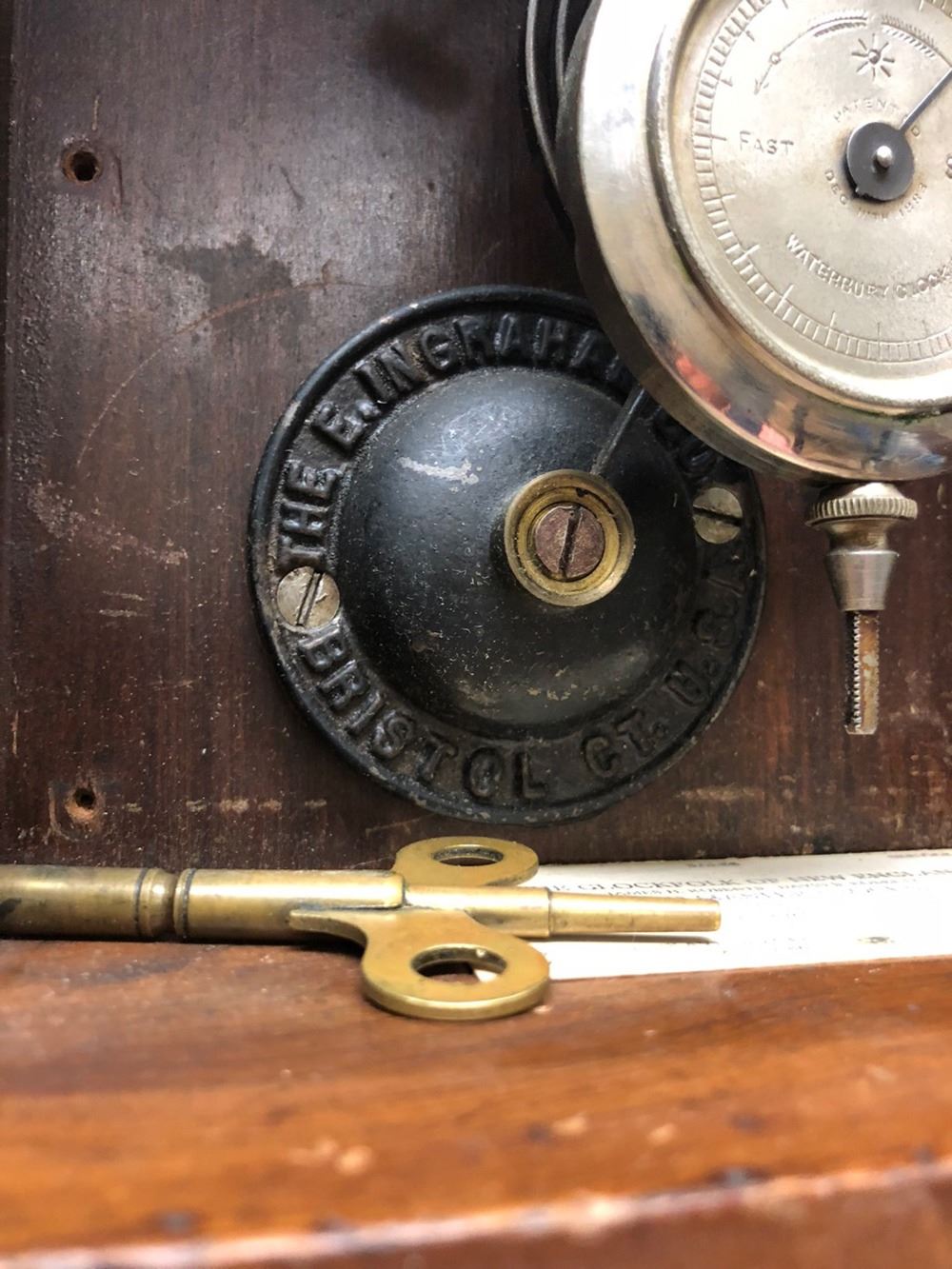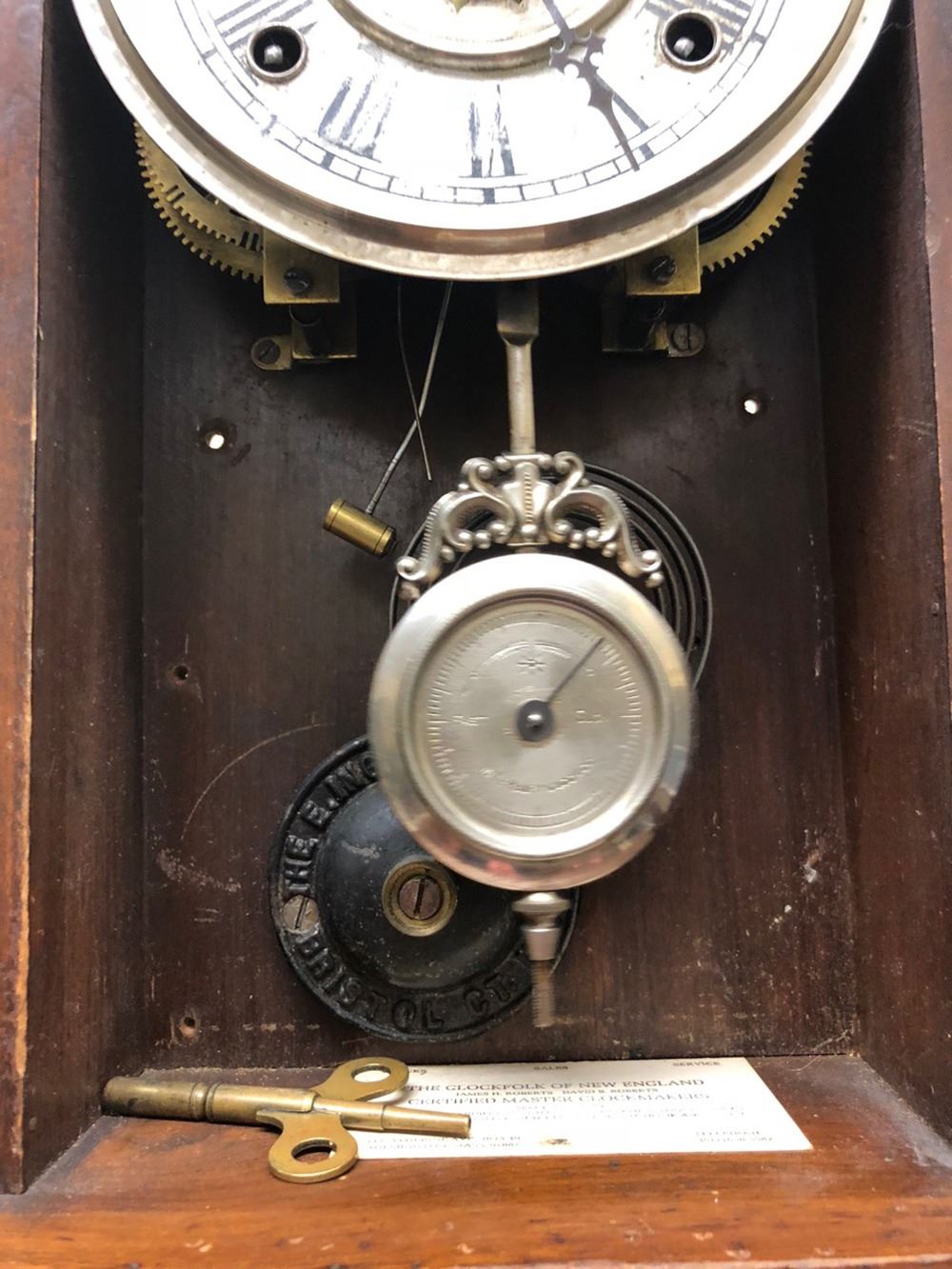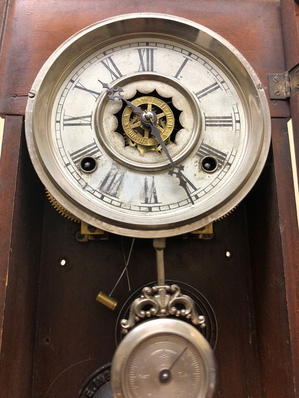 E. Ingraham and Co., Bristol, CT shelf clock, pendulum has barometer, Walnut case, key wind.
