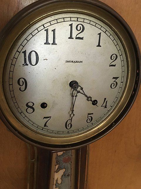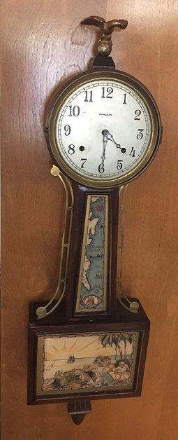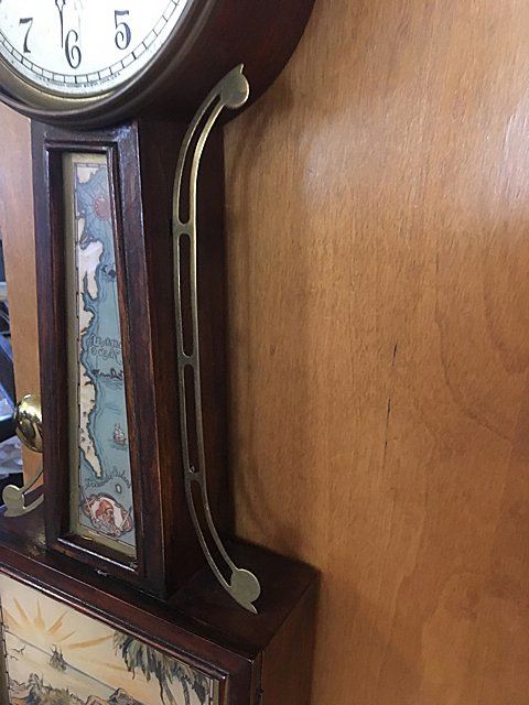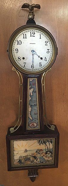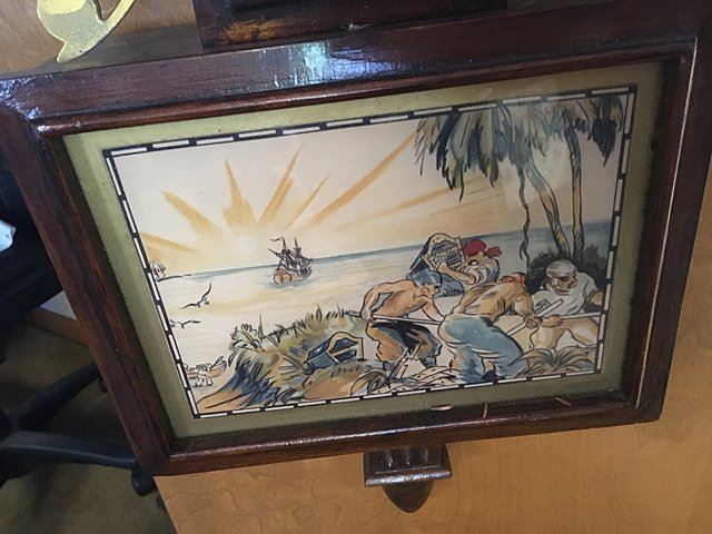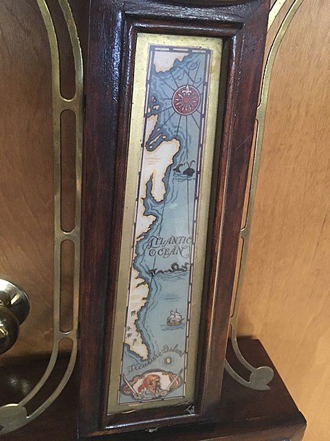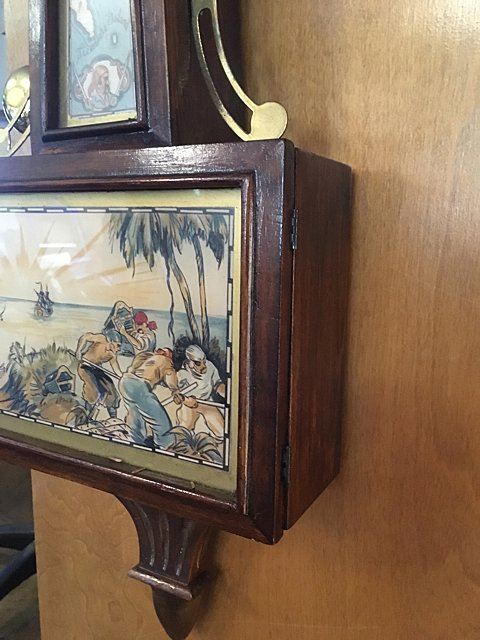 Very collectable E. Ingraham "Treasure Island" banjo clock, ca. 1927, with flying eagle finial, map and pirate motiff on neck and base. Missing face glass. Measures apprx. 37" tall x 10 1/2" wide x 4" deep.