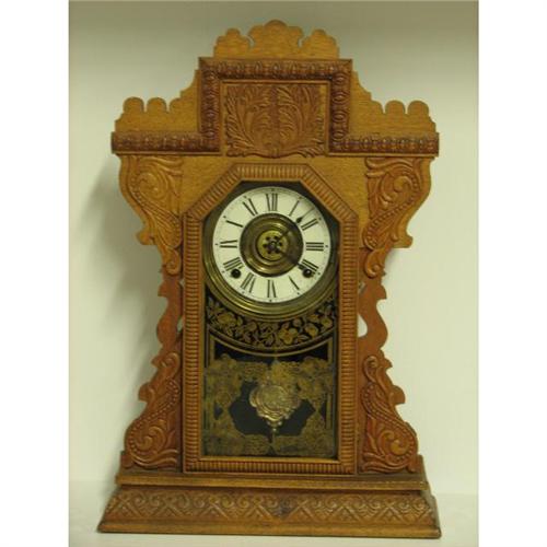 E. Ingraham and Co. pressed oak parlor clock, 8 day, An early shelf clock, c.1870's, Clockmaker: E. Ingraham and Co. Bristol CT USA. Original key and pendulum. 22 1/4"H. Condition: unserviced.