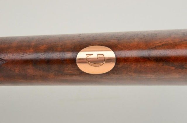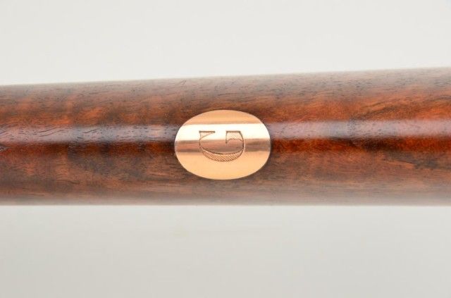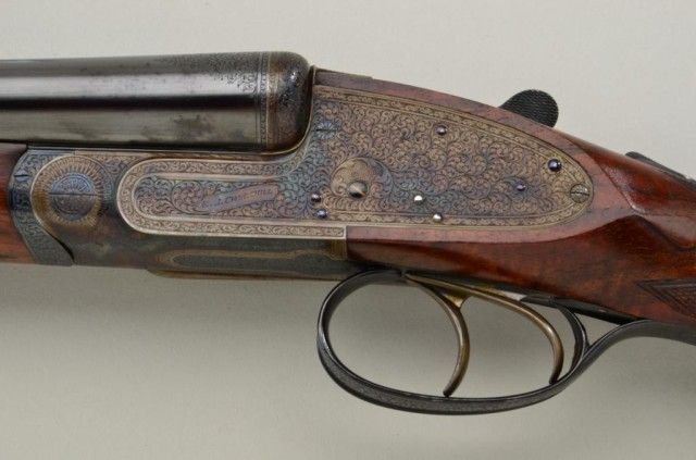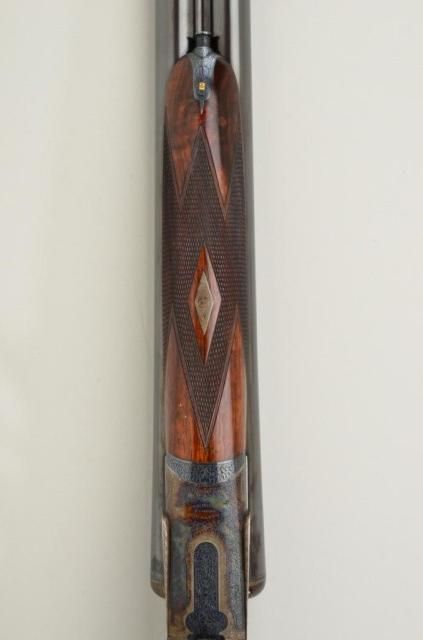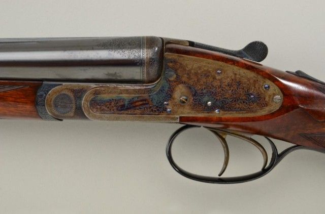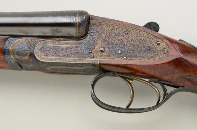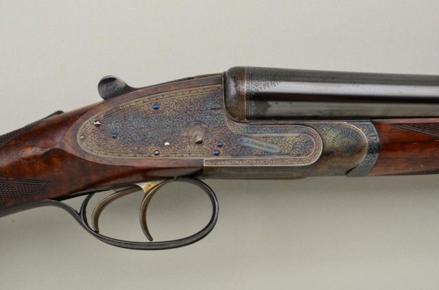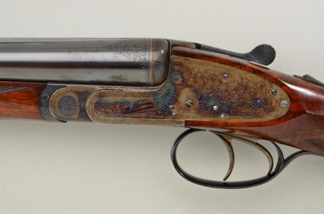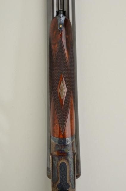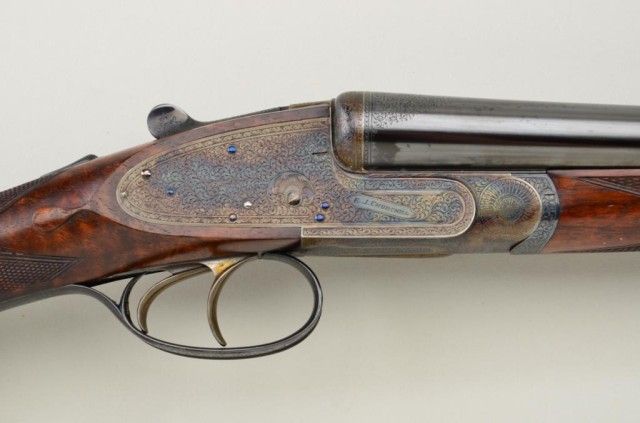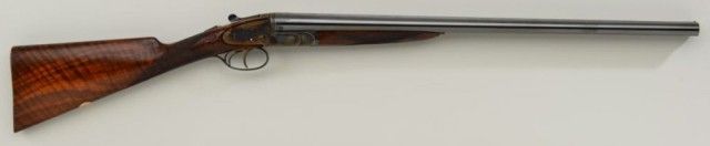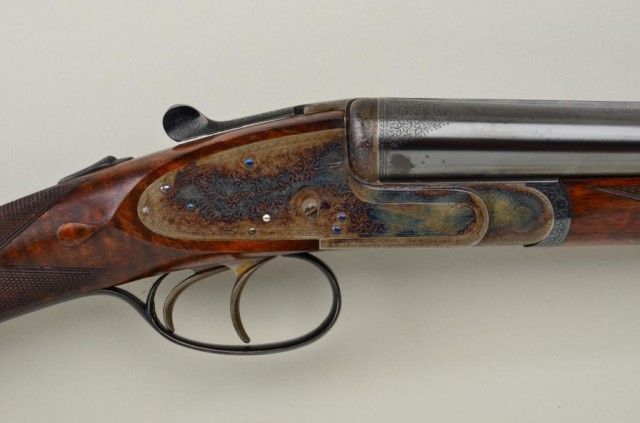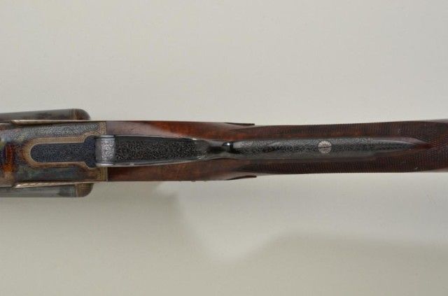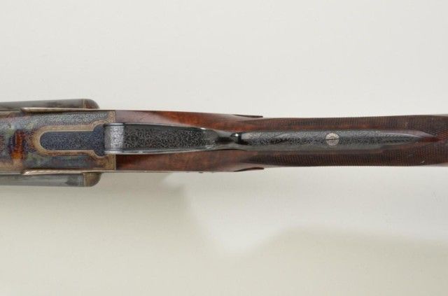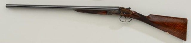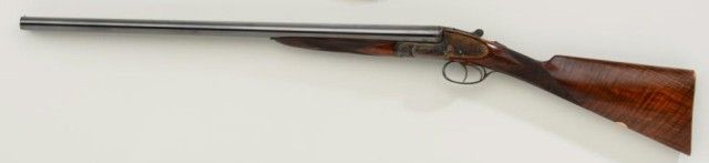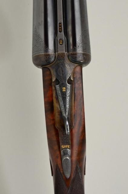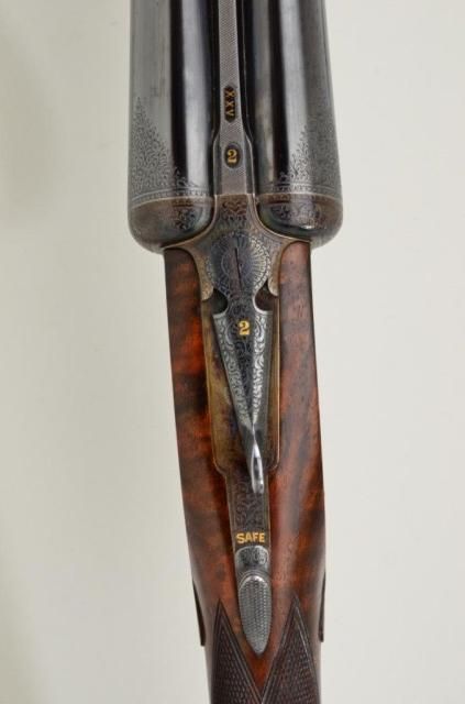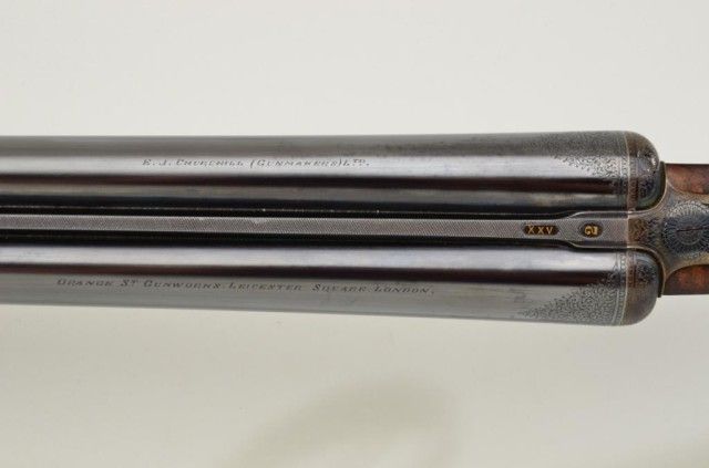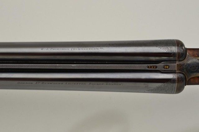 E.J. Churchill Premier best quality XXV double barrel, 12 gauge shotgun with full side locks, 25" barrels in English luggage type case, serial #7344 (Note: consecutive serial number to prior lot and numbered "2"in gold on release lever) shows 25" barrel choked modified to improved cyl on right (.20), full left (.40) with nitro proofs for 2-3/4" loads with 1-1/4 ounce shot. The barrels show a raised hand filled rib andstock measures 14" to the end of checkered wood butt. Barrels are .30 thickness left barrel and .29 thickness right barrel. The stock shows 14" to end of checkered wood butt with a2-1/2" drop at heel and 1-1/2"drop atcomb. No appreciable cast. There is a "G" inlay in the belly of the stock and name "Galvin" on top of lid. The gun is in fine to excellent condition showing some minor use with 98-99% original blue and case hardening and excellent original wood showing just some minor handling. The bores are also excellent and this Churchill has seen just a little use. From Robert E. Petersen Estate. Est.;$9,000-$18,000.