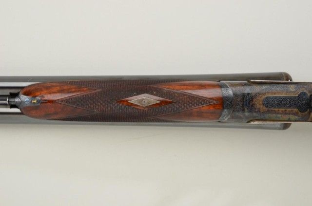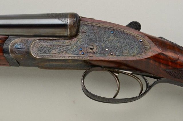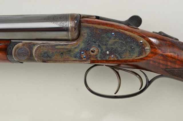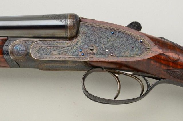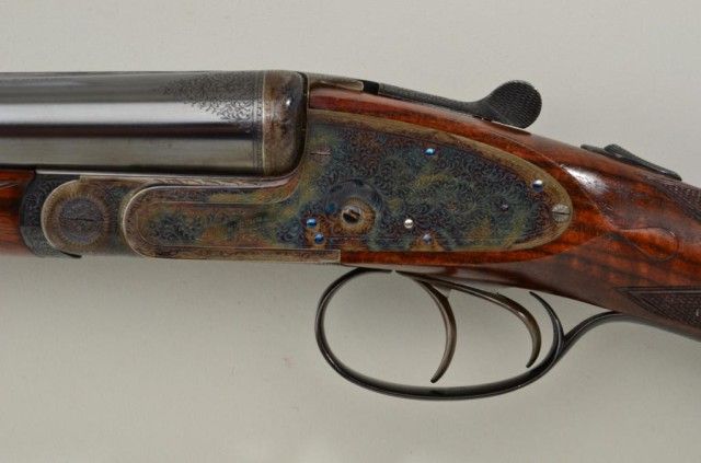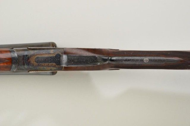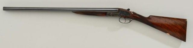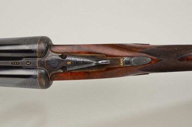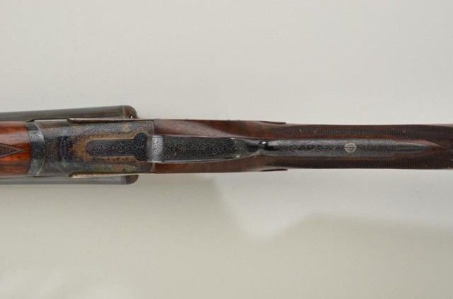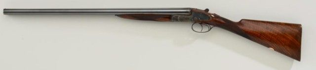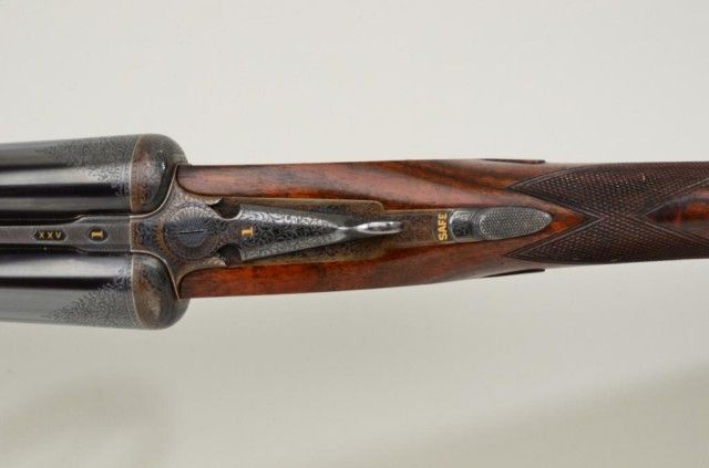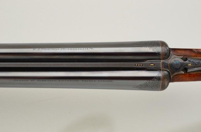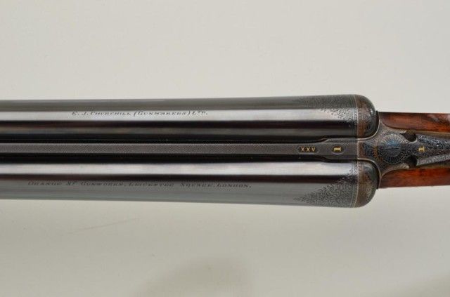 E.J. Churchill Premier quality XXV full side lock double barrel shotgun in 12 gauge with 2-3/4" proofs showing 25" barrel, double trigger, auto ejectors, serial #7343. The gun shows fine bank note scroll engraving ofextra quality with hand filled raised rib. The stock measures 14" to the end of the checkered butt and the gun is choked improved cyl right (.20) and full left (.40). The barrels are .28 thickness on left barrel and.30 on right barrel. The stock dimensions are 14" to the end of the checkered wood butt with a 2-1/2" drop at heel, 1-3/4" drop at comb. No appreciable cast. The gun remains in fine to excellent condition showing 98-99%original blue on barrels and 96-99% on trigger guard. The locks and frame show 96-99% original case hardening. The stocks are near fine with some minor handling and storage scratches. The shotgun shows just alittle use and bores are excellent. Contained within a original Churchill luggage case with label in lid which is in near fine condition also. The outside of the case shows an embossed owners name "Galvin" and