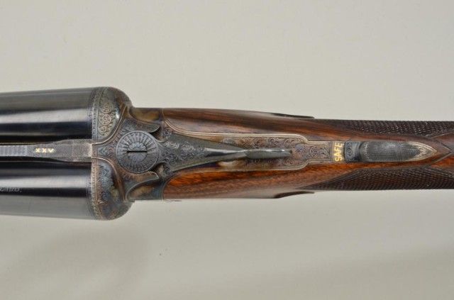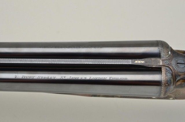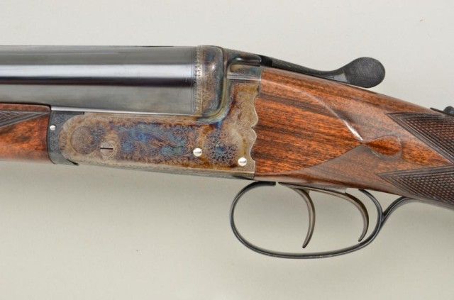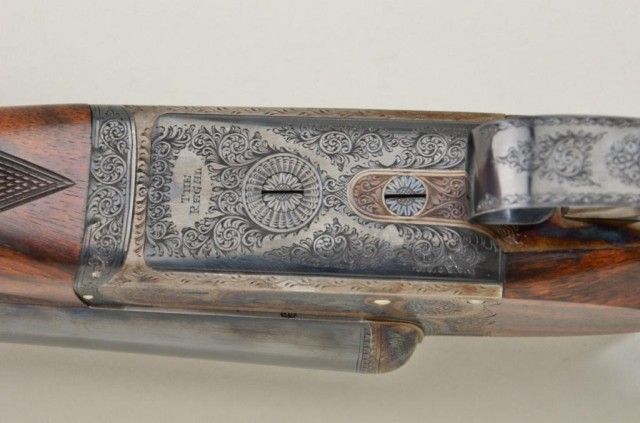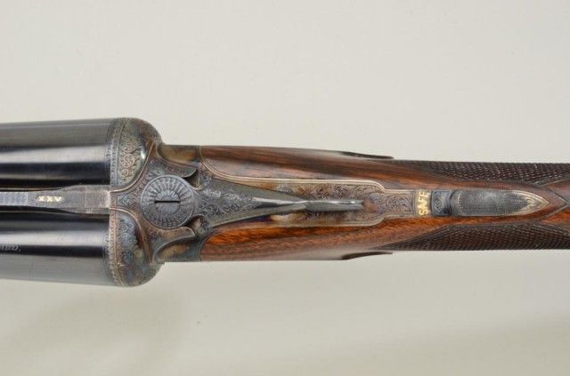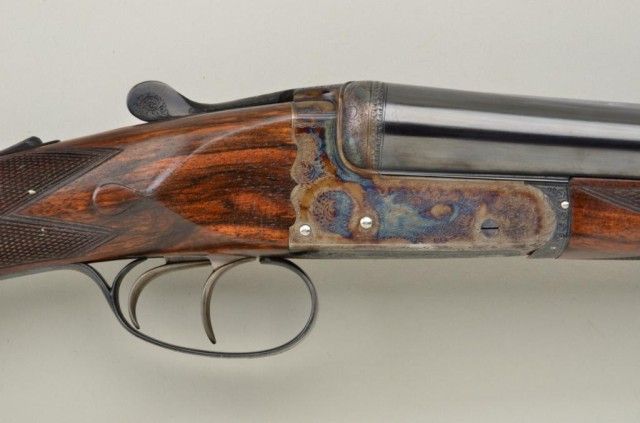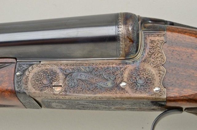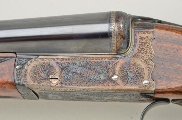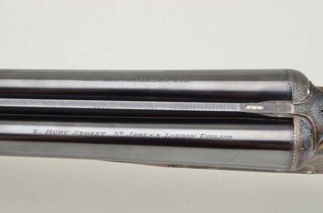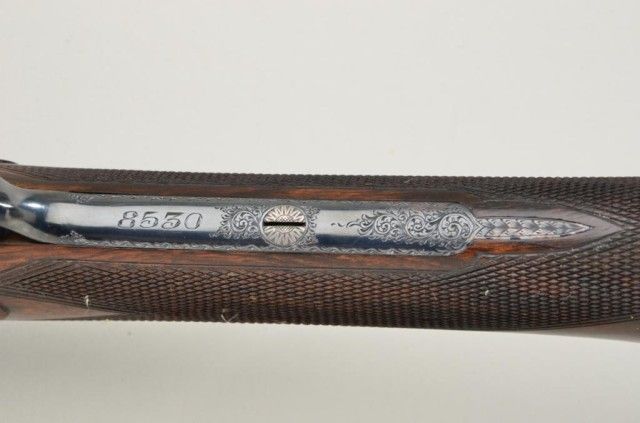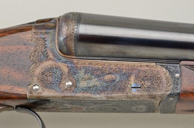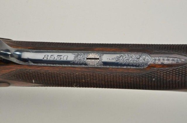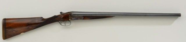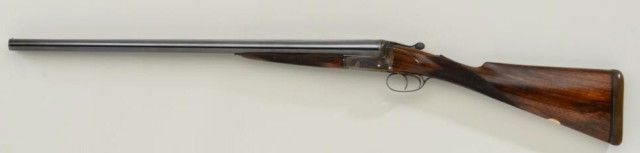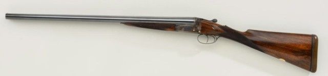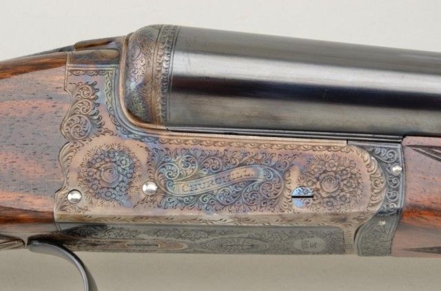 E.J. Churchill Regal XXV 12 gauge double barrel by S x S shotgun with box lock action, 25" barrels, serial #8530. The gun shows an English style straight stock and low rise non-ventilated rib. The action is nicelyscroll engraved and stock show good grain with crisp checkering. A plaque in belly of stock is inscribed "F.J.M.". The stock measures 15" to the end of an English style pad, 14-1/4" to the end of the wood. Doubletriggers auto ejectors. This Churchill remains in fine original condition showing little to almost no use, 98-99% original blue and case hardening. The stock is fine to excellent with minor handling and storage.This Regal has 2-3/4" chambers, is choked improved modified both barrels (.27), drop at the heel 2-1/8" drop mat the comb 1-7/8", no cast, both barrels show a wall thickness of .22. Robert E. Petersen Estate.Est.;$5,000-$10,000.