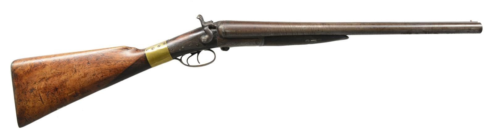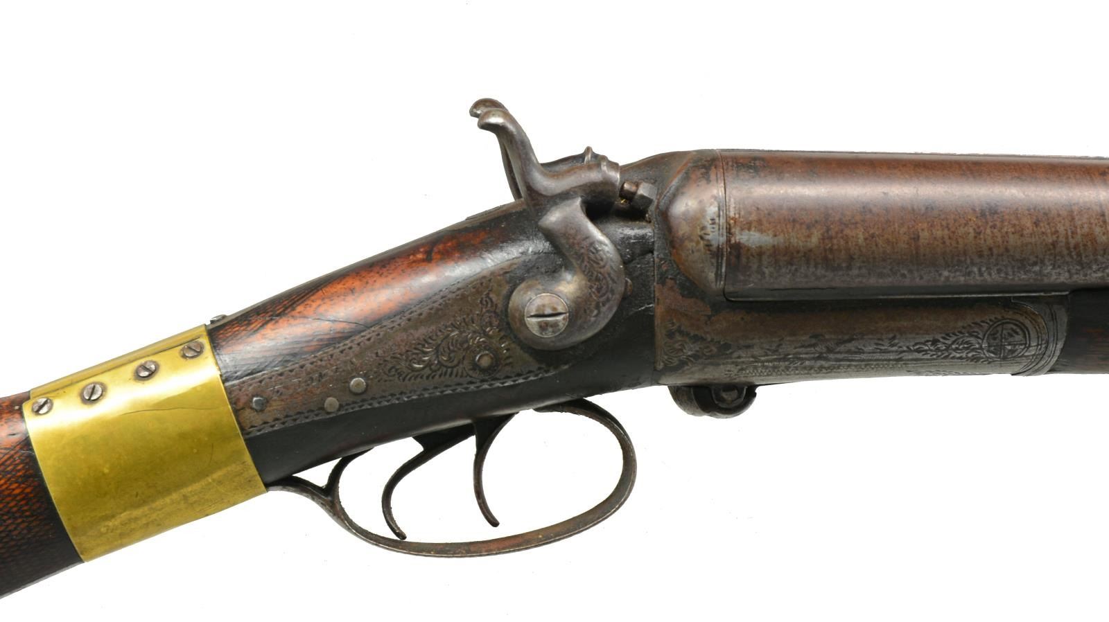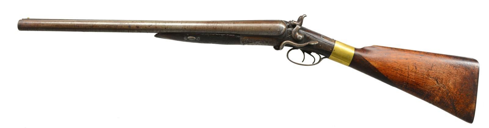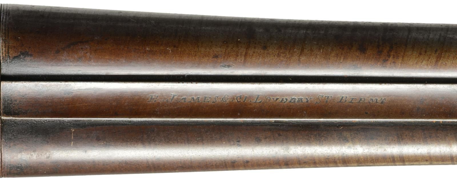 Cal. 10 Ga., 2 7/8". S# 18646. Bbls. 20 1/8" of twist steel. Rib is marked "E. JAMES & C. LOVEDAY. ST. BIRM". Rnd. bodied side lever action w/ exposed hammer back action locks. Action, locks & trigger guard bow have borderline & simple scroll engraving. Key fastened forearm & straight hand stock of English walnut w/ steel shotgun buttplate having name shield in toeline. Stock has a brass wrapping repair at wrist. UNATTACHED ACCESSORIES: binder of diagrams & explanation of markings from Wendell Grangaard, the Guns of History Inc. Sioux Falls, SD. Mr. Grangaard interprets many of these markings to be "Togia", the written sign language of the Plains Indians. His interpretation attributes the shotgun to "Feathered Earring", a Minneconjou who was born in 1849. Feathered Earring fought at the Little Big Horn. CONDITION: gun has a worn gray/brown appearance. Forearm shows extremely heavy wear & marks that appear to be from pressing down barbed wire fence. Stock has worn appearance showing numerous scratches & marks including those interpreted by Mr. Grangaard as Indian applied. Sound locks. Right bore is heavily pitted. Left bore shows sm. spots of pitting. (01-17981/DS). ANTIQUE. $3,000-5,000.