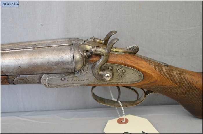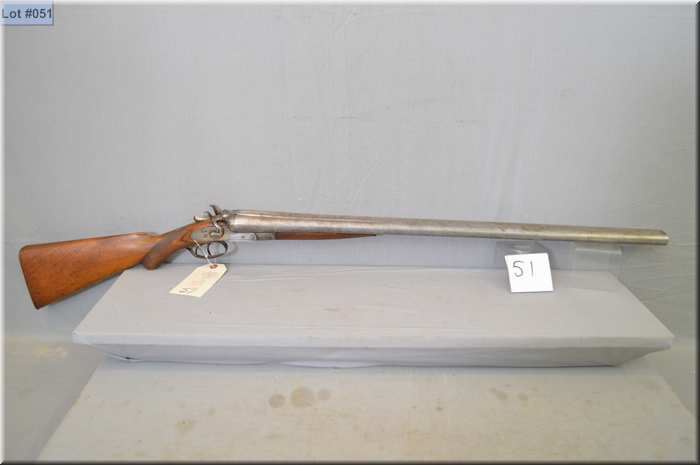 E.James & Co. ( Loveday St. Birmingham ) Model side by side hammer .12 Ga Shotgun w/ 30" bbl [ faint traces of Damascus finish faded to grey, lightly engraved locks & hammers, checkered rounded butt stock, w/ebony tipped forend, chip missing by right side trigger guard, metal butt plate, gun is a bit loose ] Ser # 23025