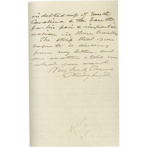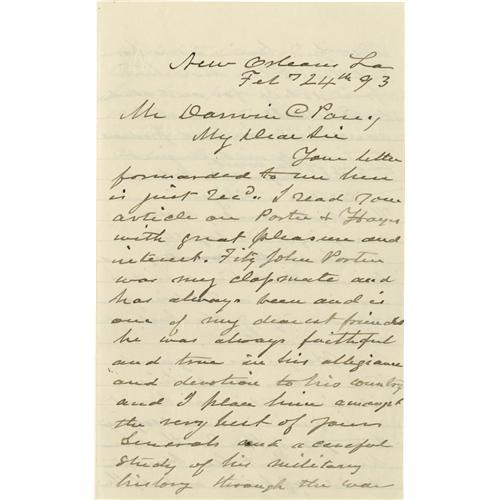 <B>E. Kirby Smith Autograph Letter Signed</B></I> "<I>E. Kirby Smith.</B></I>" Three pages, 5" x 8", New Orleans, Louisiana, February 24, 1893. The letter was written to Darwin C. Pavey and discusses Smith's admiration for Fitz John Porter. Porter had been the victim of an unjust court martial by rival generals when in reality he had been a model general and soldier. Smith explains this by saying in the letter, "<I>…his friendship for and attachment to McClelland</B></I> [sic] <I>was his cardinal sin and produced that cruel and unjust finding of the court, which degraded Porter as a Soldier & citizen. The whole country now recognizes his loyalty & devotion to the country and know that his merits & services as a soldier are deserving of the highest commendation…</B></I>" Smith was himself a general, although it was for the confederate side. <BR><BR>The letter is in very fine condition; usual folds are present. From the Henry E. Luhrs Collection. Accompanied by LOA from PSA/DNA.