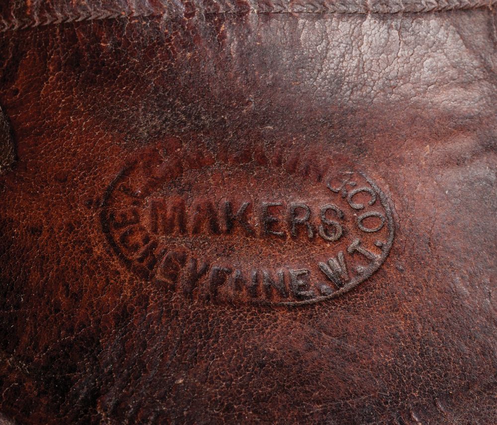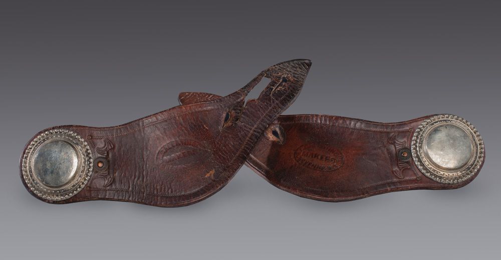 E. L. Gallatin & Co. Cheyenne, Wyoming Territory. Dove wing spur straps marked with large cartouche in center of each strap "E. L. Gallatin & Co. Cheyenne, W.T." Well used with worn mark but unusual and scarce. Old nickeled fancy conchos.