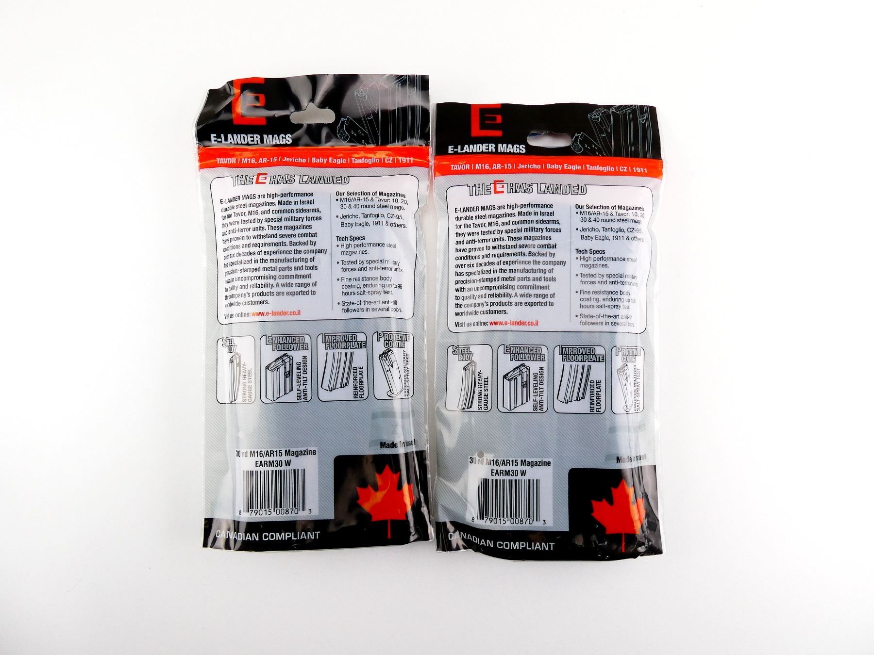 LOT INCLUDES; (2) 5.56MM / .223 REM MAGS, 5/30 ROUND PINNED MAGS, BLUED STEEL CONSTRUCTION, MARKED: "5.56MMX45", "E-LANDER MAGS", "MADE IN ISRAEL", ETC., APPEARS NOS IN ORIGINAL PACKAGING. SEE PHOTOS. PAL REQUIRED.