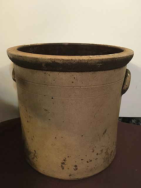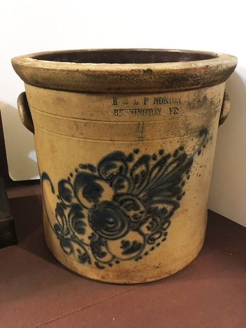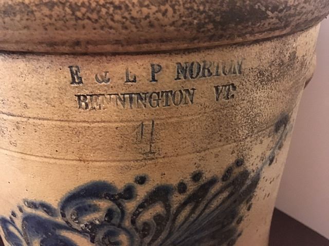 E & LP Norton, Bennington, VT crock with cobalt blue dot floral pattern. in very nice condition for age of this piece, c. 1850-1880s. Double handles and E & LP Norton, Bennington, VT stamp. Measures approx. 12" x 12".
