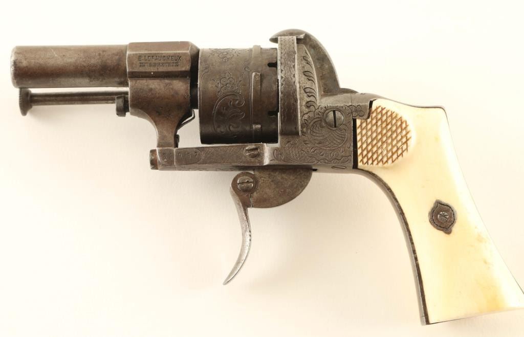 SN: 33957 Antique Belgium proofed double-action-only copt of the Lefaucheux revolver chambered for a 7.62mm pinfire cartridge. Features ‘B’ coverage European scroll engraving, 2 ¼” part octagon/part round barrel, no sights, folding trigger, spurless hammer, non-fluted six-shot cylinder, manual ejector rod, steel frame and ivory grips with checkered panels at the top. Revolver retains traces amounts of bluing with the majority of the metal surfaces displaying and aged brown patina. The trigger does not reset on its own otherwise the action is in good working order, the bore is excellent and the ivory grips are very good with an aging caramel color. Condition is NRA Very Good. ***Antique Firearm***