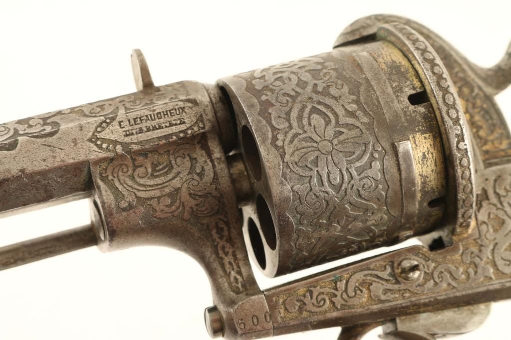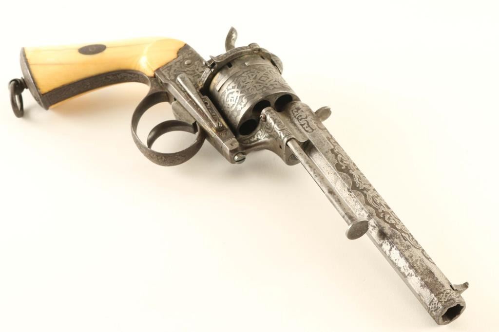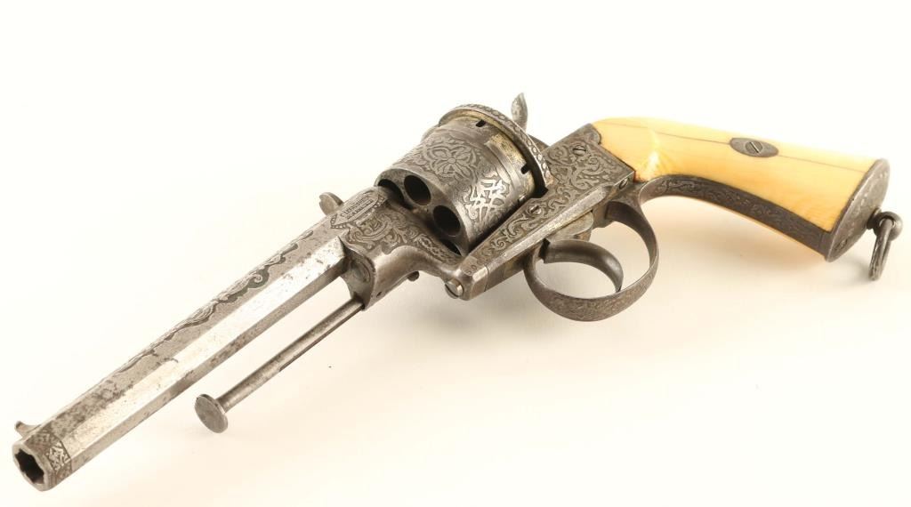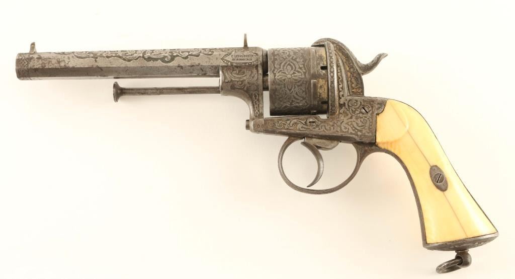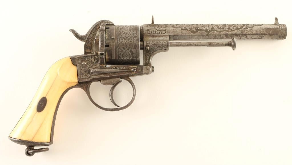 A Large 11 Millimeter Fully Engraved/Etched Gilt Pinfire Revolver By E. Lefaucheux With Fine Ivory Grips. 6 inch octagonal barrel fully etched. Cylinder, frame, and buttplate with lanyard all etched ensuite in flowing scrolls and strapwork. Ivory grips with lovely age patina and age cracking. Traces of gilt finish throughout. Finished in French gray. This is a large showy pinfire 12 inches overall and works well both single and double action. Condition is NRA Good ***Antique Firearm***