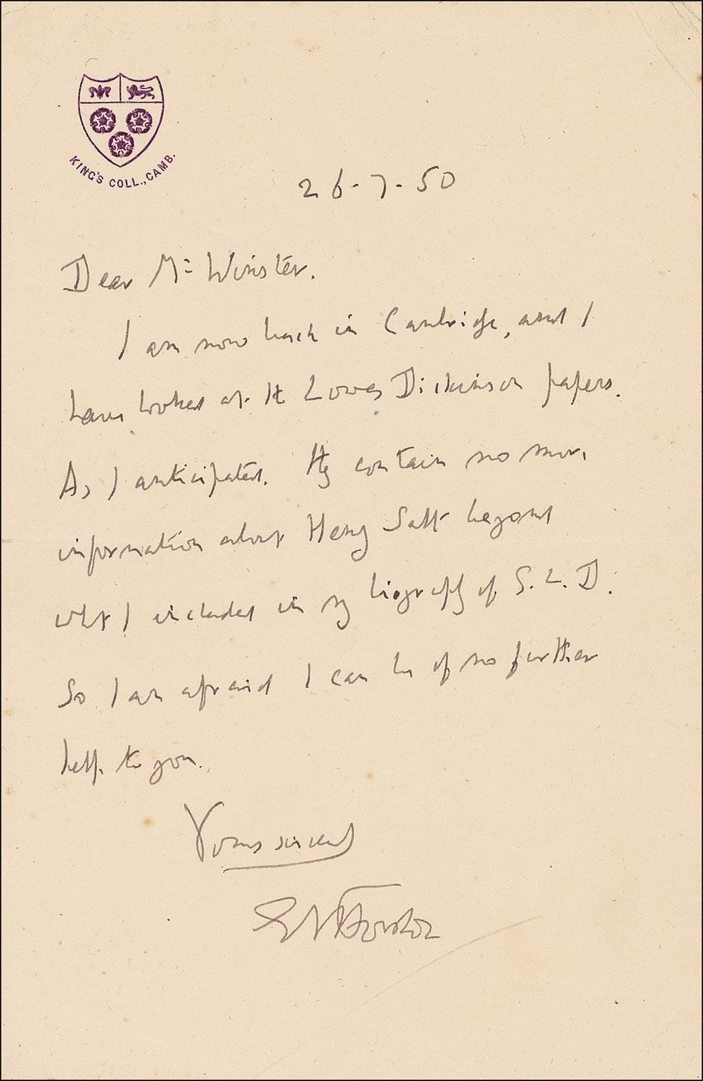 British writer (1879–1970) best known for such novels as A Room with a View, Howards End, and A Passage to India. Scarce ALS, 4.5 x 6.75, July 26, 1950. Forster writes to Mr. Winster. In part: “I am now back in Cambridge and I have looked at H. Loves Dickinson papers. As I anticipated, they contain no more information about Henry Salt…which I included in my biography of S.L.D. So I am afraid I can be of no further help.” In fine condition, with some light creasing to corners, a few wrinkles, and a bit of light soiling. Pre-certified PSA/DNA and RRAuction COA.
