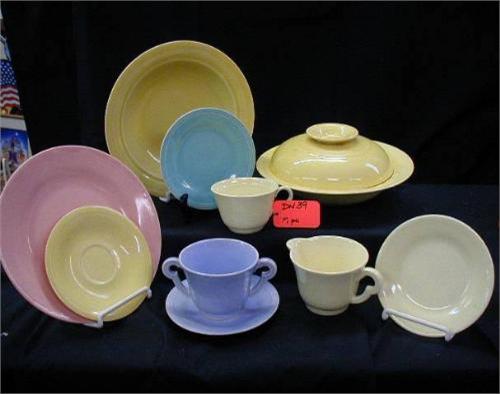 E.M. KNOWLES inDEANNAin CARIBEAN COLORS ASST INCLUDES, (1) YELLOW 10in BOWL, (1) 10in COVERED BOWL YELLOW, (2) 9 1/4in PLATE (1 BLUE 1 PINK),SAUCERS (1) PINK- (1) BLUE- (1) GREEN - (3) YELLOW, BREAD PLATES (1) PINK- (2) YELLOW- (2) GREEN, (1) YELLOW CUP, (1)