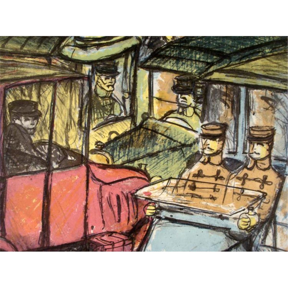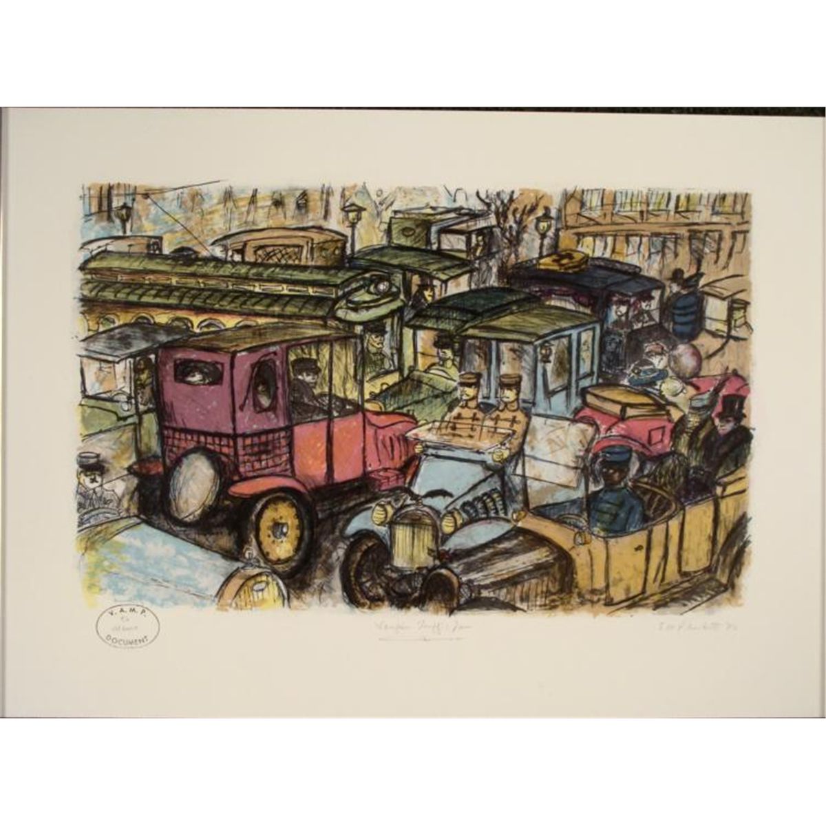 Midnight rush hour in Transylvania. Everybody is in a hurry to get a quick bite to eat... * Artist: Edward Plunket Title: "Vampire Traffic Jam"Medium: Print on paper Condition: ExcellentSize: 19" x 26"Edition: V.A.M.P. Document Dedicated: "Mauro"Date: 1980Biography * * Plunkett's style is unique in contemporary art. It is a style that has developed as a result of his interest in the concept of surrealism, and in fantastic art. With fantasy in mind, he has adapted the pictorial material from the silent motion picture era to express a statement in his art that is both humorous and horrific. The Plunkett family name is eminent in Irish culture and thought E. M. Plunkett is American-born, he feels that his work and his ideas carry out the heritage of his forebearers. * - From http://www.artrev.com/art/artists/biography.asp?aid=218&artist=Edward%20Plunkett * *