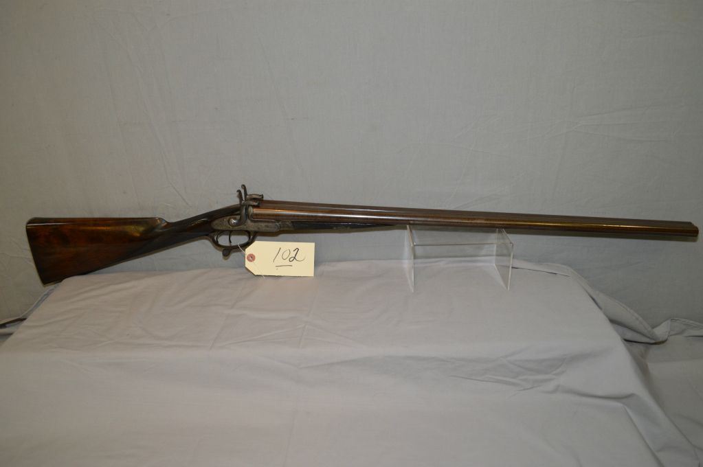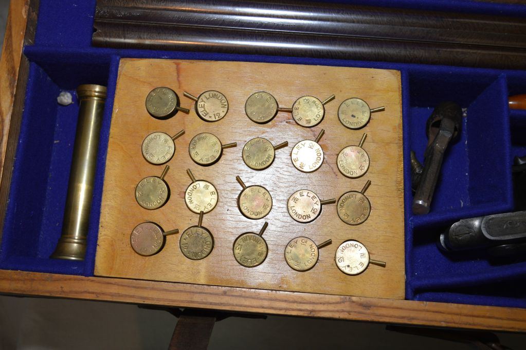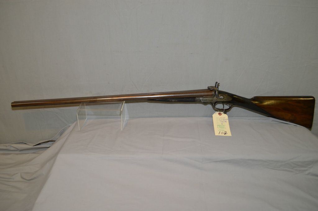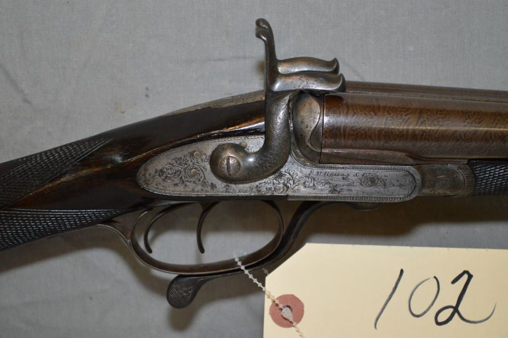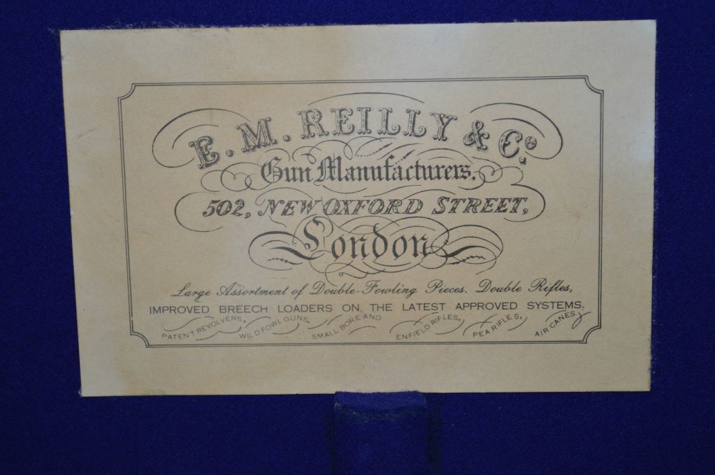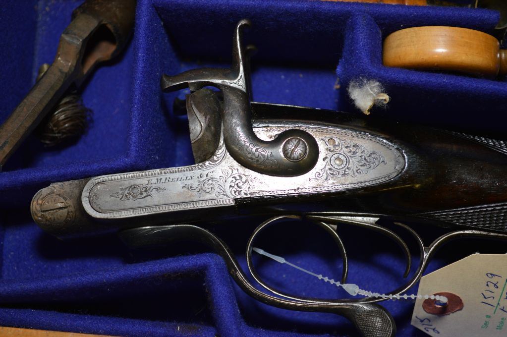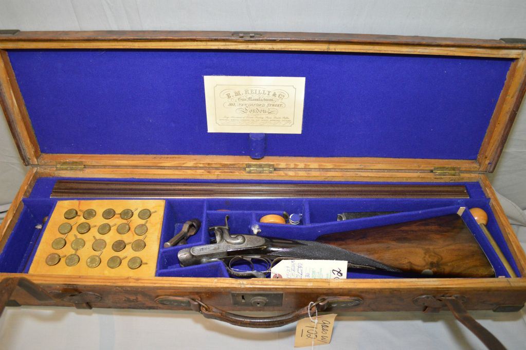 E.M. Reilly & Co., 502 Oxford St. London .12 Bore PIn FIre Side By Side Shotgun w/ 30" bbl [ Circa 1840 , Rare high quality shotgun, bbl retains almost all brown Damascus finish. Bores are mirror bright, bar action side lock features two dolphin style hammers & operates with Jones under lever. All metal parts are profusely engraved in English style scroll, dark walnut straight English stock and forend are finely checkered in excellent conditon. Gun is housed in Best Quality English oak and leather case complete w/ pin fire accessories, plus 20 rnds original Eley pinfire paper hulls ] Ser # 15129 ANTIQUE NO PAL REQ