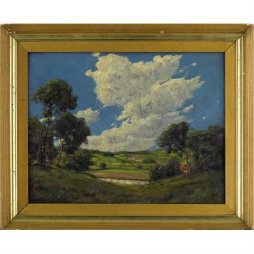<B>E.M. STACK (American, 20th Century)</B></I><BR><I>High Clouds above Scranton, Pennsylvania</B></I>, 1917<BR>Oil on cardboard<BR>12 x 14-1/2 inches (30.5 x 36.8 cm)<BR>Signed lower right: <I>E.M.Stack 1917</B></I><BR>