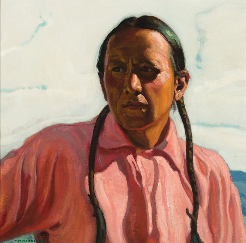 In a 1986 issue of Southwest Art, Ernest Martin Hennings’ daughter said, “Frank Samora was Dad’s favorite model. A young and handsome Indian when they first met, he was also our handyman and besides posing, he helped with irrigation and yard work. He had lunch with us in the kitchen every working day and was a friend as well as a model. Daddy painted him many times and their relationship spanned several decades.”