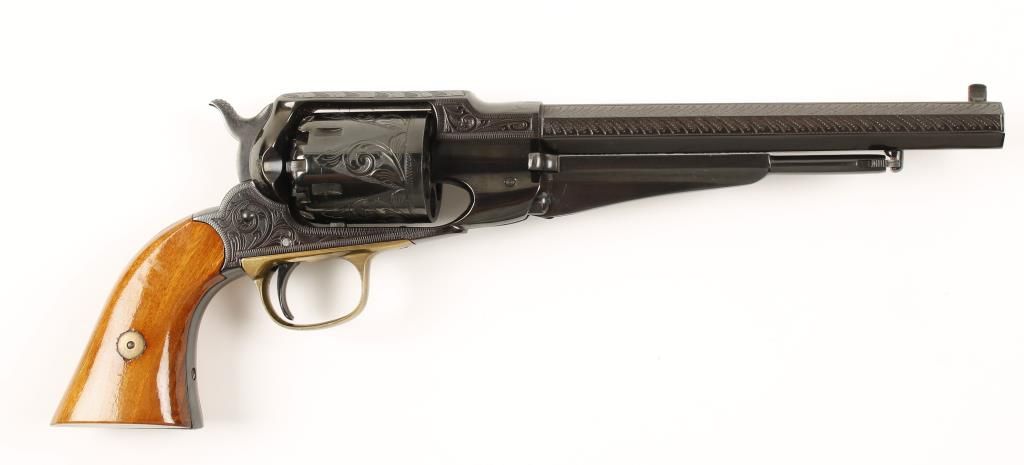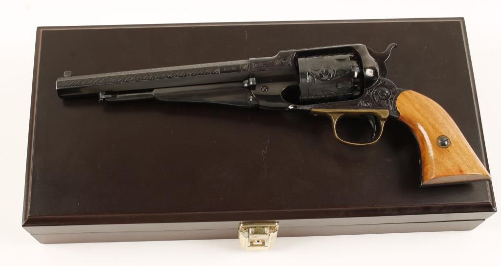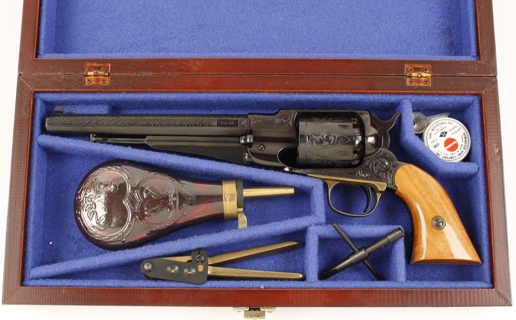 Cased engraved replica black powder single action 6-shot percussion pistol. Blued 8" octagon barrel. Blued loading lever, cylinder, frame, hammer and trigger. Brass trigger guard. Not cut for a shoulder stock. Lined hardwood case with loading and maintenance tools and a key. Condition is like new in box. *Antique Firearm*
