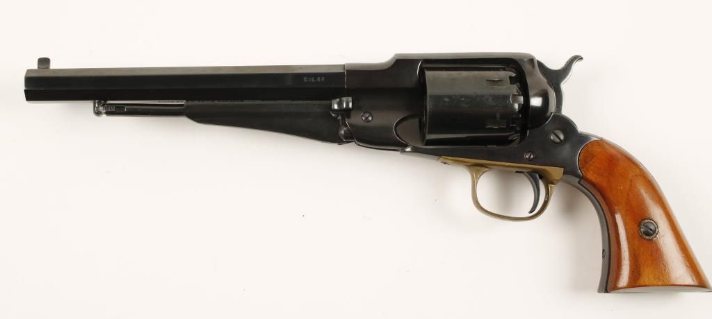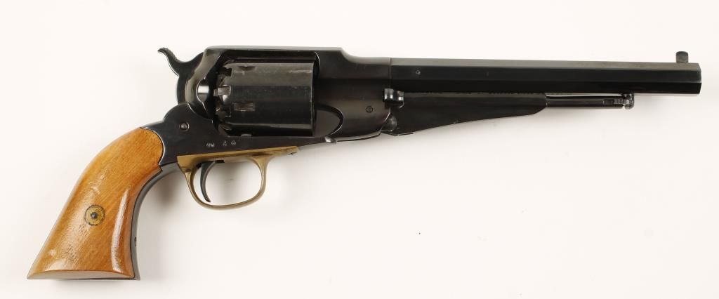 Replica black powder single action 6-shot pistol. 7-1/2" blued octagon barrel, loading lever, cylinder, frame, hammer and trigger. Brass trigger guard. Not cut for a shoulder stock. Condition is very good. *Antique Firearm*
