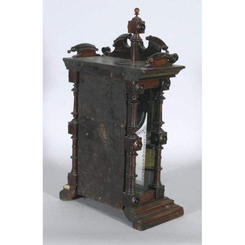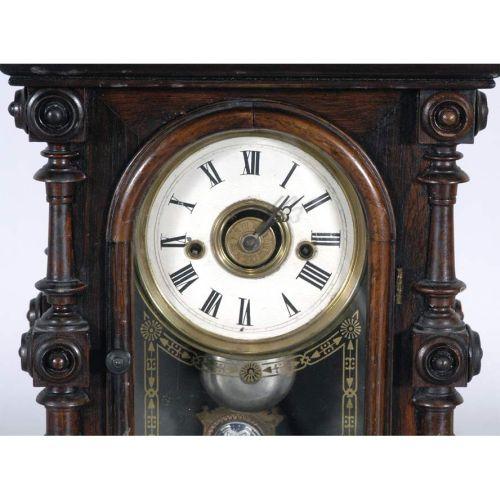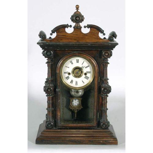 E.N. WELCH PATTI ROSEWOOD MANTLE CLOCK with original Sandwich Glass pendulum bob, 20 1/2" high, circa 1875 CONDITION REPORT: original finish, one rosette replace, one missing, mounting bracket screw for movement to back replaced, boring for bezel to mask screw stripped and screw needs replacing. PACKING AND SHIPPING: We offer packing (double boxed in most cases) and shipping of this item within the Continental United States by USPS or UPS (our choice- boxes over 30lbs or oversized may be recalculated based on buyer's location), NOT INCLUDING INSURANCE (it will be added when we know the sales price) for $40