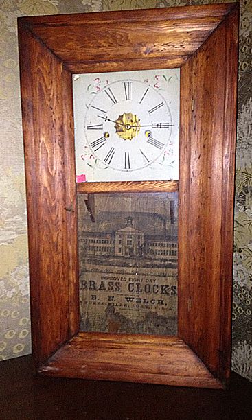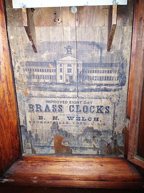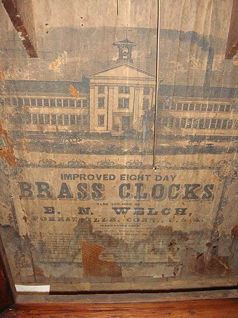 E.N. Welch, Forestville, CT, OG Shelf Clock, nice large lable (very rare and uncommon) and case. Measures 29" high x 16" wide x 4" deep. The E. N. Welch Manufacturing Company was a joint stock corporation formed July 6, 1864 to succeed an older private firm making clocks under the name of E. N. Welch. Elisha N. Welch (1809x1887) had been making clocks at a factory site on East Main Street at Forestville, Conn. since taking over the bankrupt business of J. C. Brown about 1856.