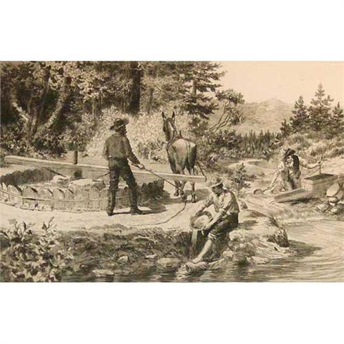 E Narjot etching from John Muirs Elephant Portfolio titled ''Primitive Methods of Early Days'' Image size 8' x 12''