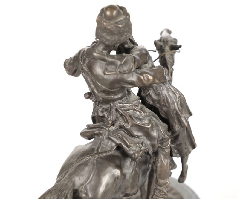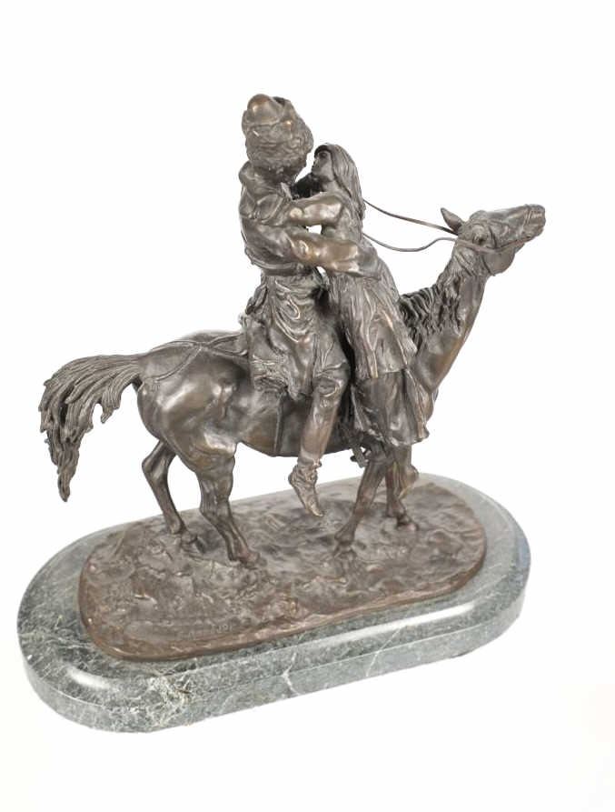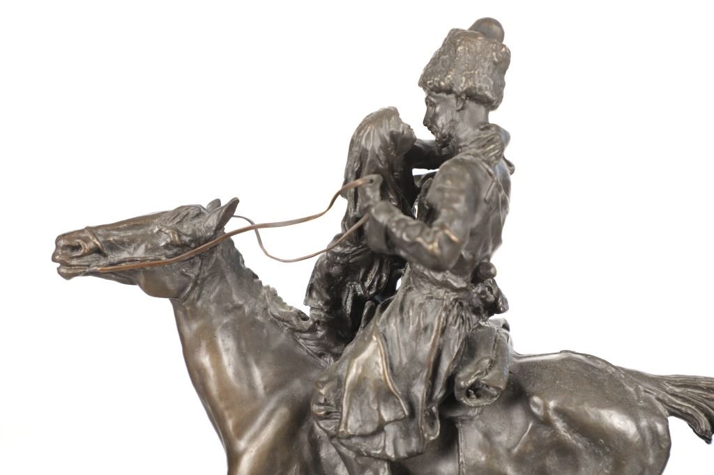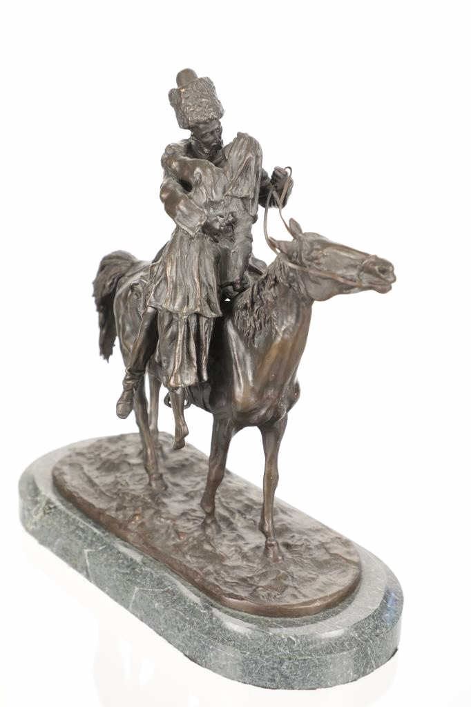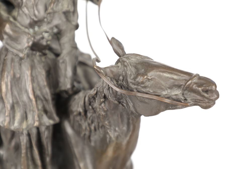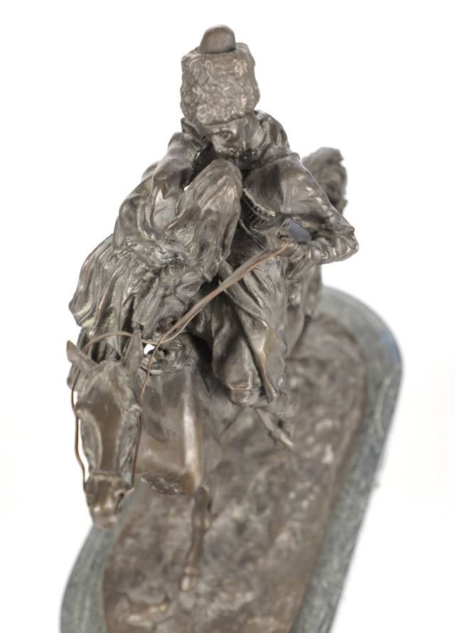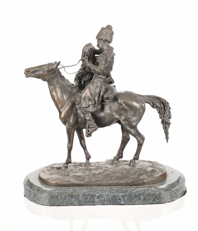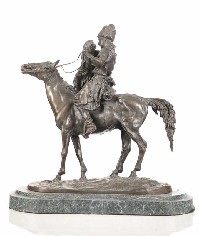 Featured in this lot is a bronze sculpture of a Russian Cossack and a woman by Austrian artist, E. Nahcepe. The bronze sculpture features a wonderfully and professionally crafted bronze construction on a marble base. The bronze features a depiction of a Russian Cossack and a woman climbing up on the horse from the stirrup. The bronze is marked as follows: F. Chenin - E. Nahcepe. E. Nahcepe is an Austrian Impressionist & Modern artist who was born in the Late 19th Century. E. Nahcepe's work has been offered at auction multiple times, with realized prices ranging from 289 USD to 10,418 USD, depending on the size and medium of the artwork. Since 2012, the record price for this artist at auction is 10,418 USD for Cossack figured on horseback. The piece sold at A.H. Wilkens Auctions & Appraisals in Toronto, Canada in 2023. The overall condition of this bronze sculpture is good with no obvious signs of damage. The measurements of this bronze sculpture are 15 1/2" x 15 1/4" x 6 3/4".*