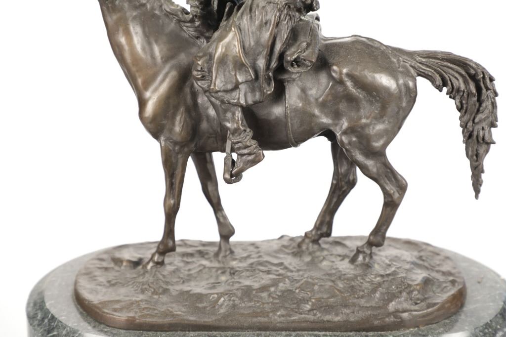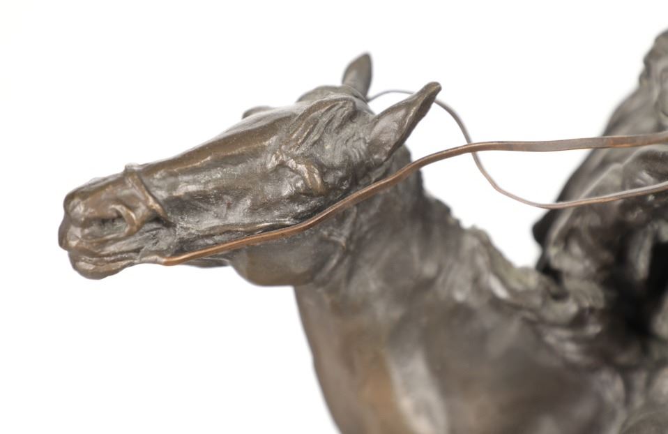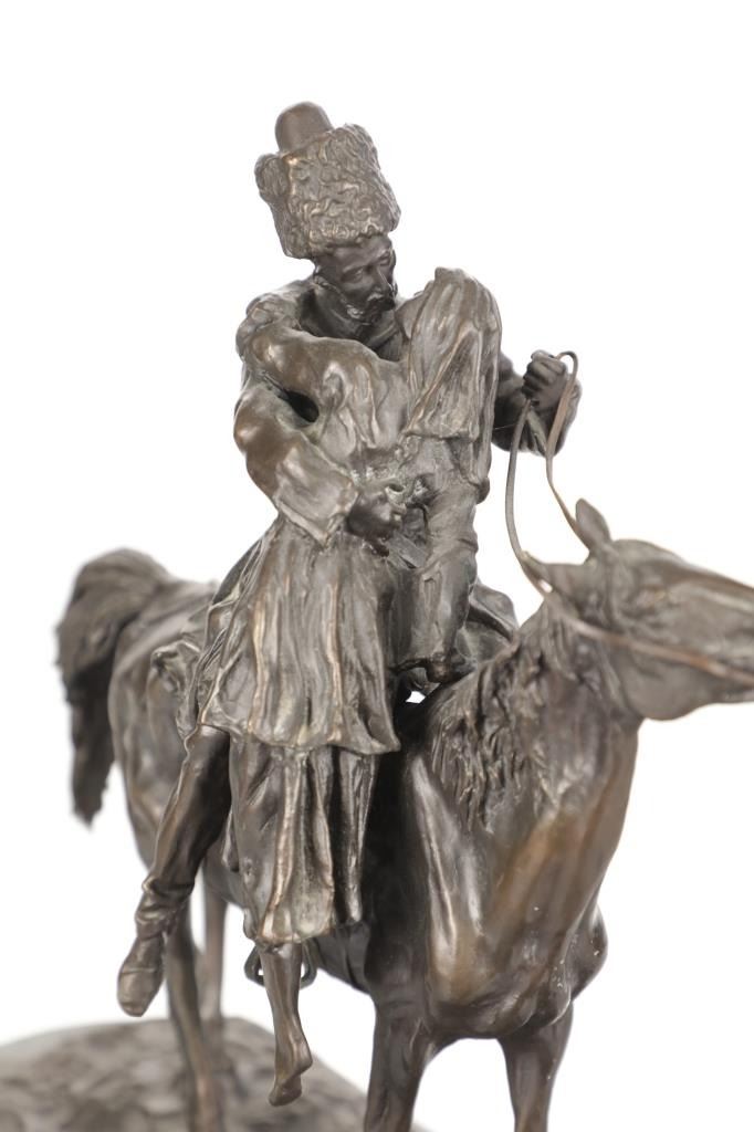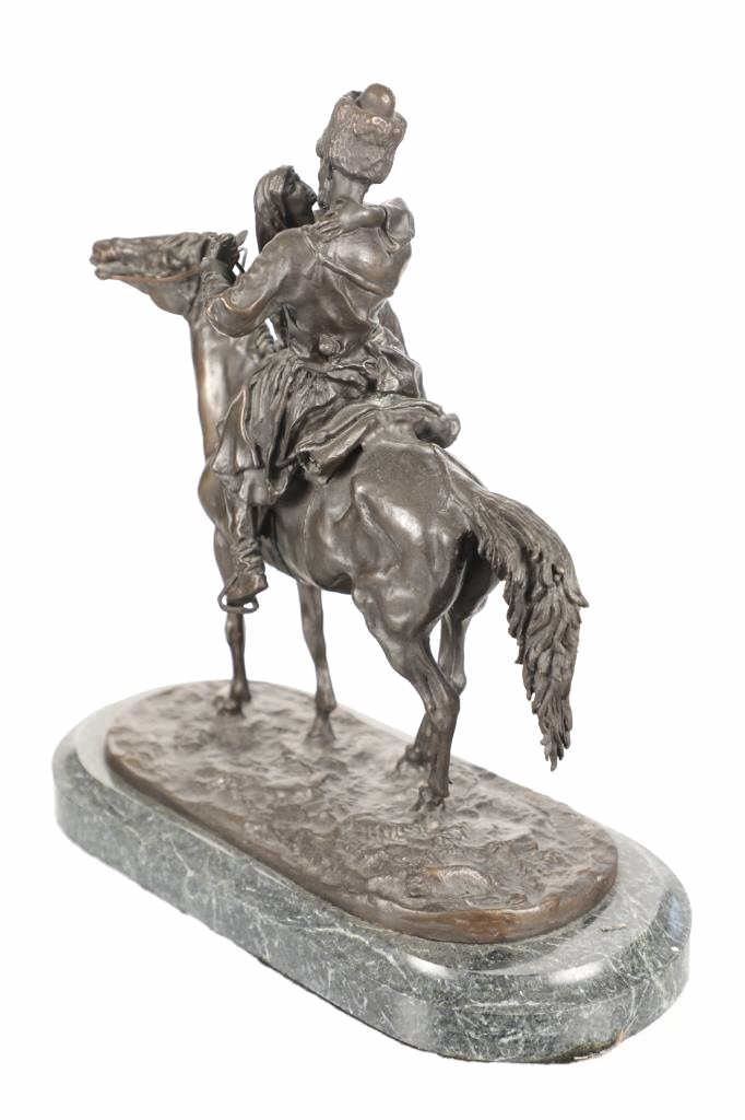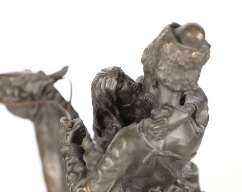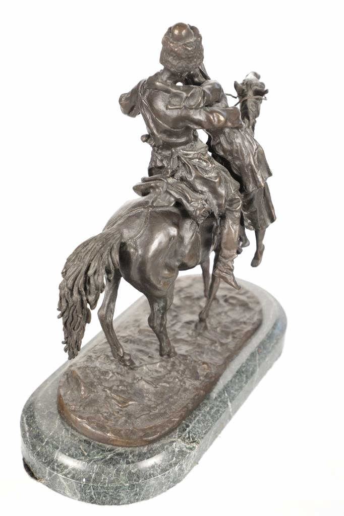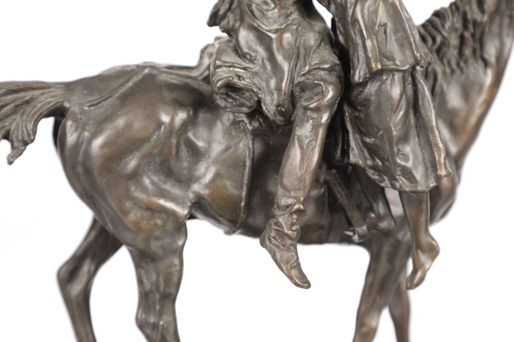 Featured in this lot is a bronze sculpture of a Russian Cossack and a woman by Austrian artist, E. Nahcepe. The bronze sculpture features a wonderfully and professionally crafted bronze construction on a marble base. The bronze features a depiction of a Russian Cossack and a woman climbing up on the horse from the stirrup. The bronze is marked as follows: F. Chenin - E. Nahcepe. E. Nahcepe is an Austrian Impressionist & Modern artist who was born in the Late 19th Century. E. Nahcepe's work has been offered at auction multiple times, with realized prices ranging from 289 USD to 10,418 USD, depending on the size and medium of the artwork. Since 2012, the record price for this artist at auction is 10,418 USD for Cossack figured on horseback. The piece sold at A.H. Wilkens Auctions & Appraisals in Toronto, Canada in 2023. The overall condition of this bronze sculpture is good with no obvious signs of damage. The measurements of this bronze sculpture are 15 1/2" x 15 1/4" x 6 3/4".*