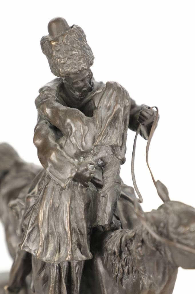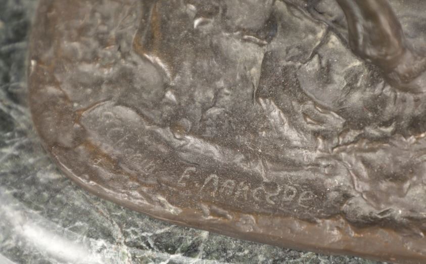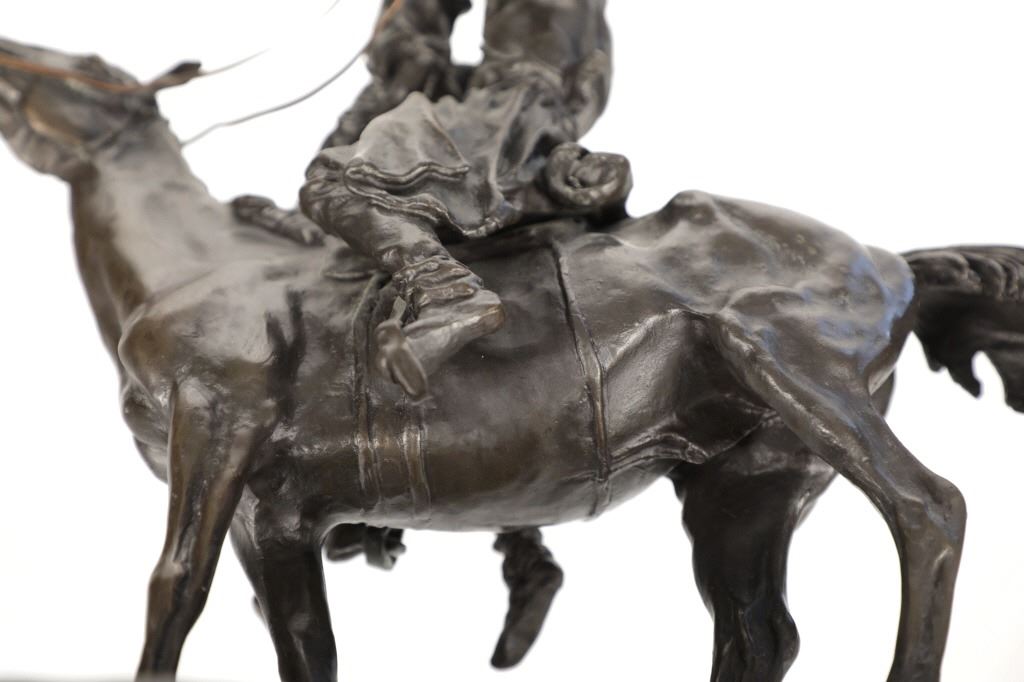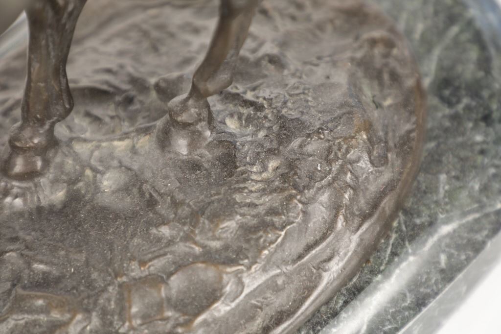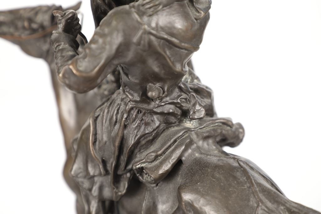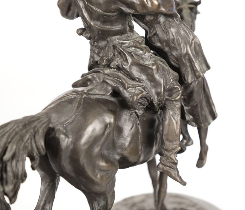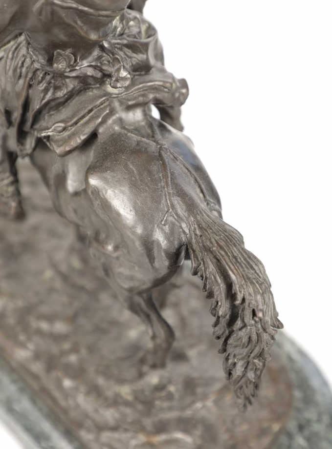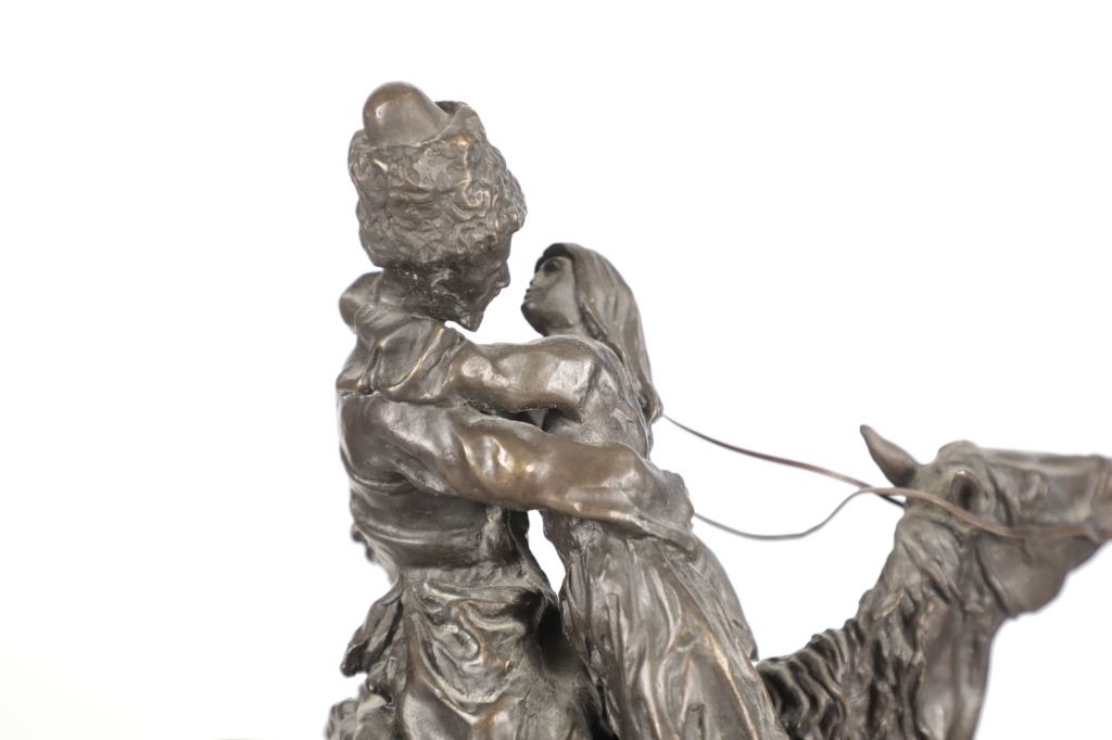 Featured in this lot is a bronze sculpture of a Russian Cossack and a woman by Austrian artist, E. Nahcepe. The bronze sculpture features a wonderfully and professionally crafted bronze construction on a marble base. The bronze features a depiction of a Russian Cossack and a woman climbing up on the horse from the stirrup. The bronze is marked as follows: F. Chenin - E. Nahcepe. E. Nahcepe is an Austrian Impressionist & Modern artist who was born in the Late 19th Century. E. Nahcepe's work has been offered at auction multiple times, with realized prices ranging from 289 USD to 10,418 USD, depending on the size and medium of the artwork. Since 2012, the record price for this artist at auction is 10,418 USD for Cossack figured on horseback. The piece sold at A.H. Wilkens Auctions & Appraisals in Toronto, Canada in 2023. The overall condition of this bronze sculpture is good with no obvious signs of damage. The measurements of this bronze sculpture are 15 1/2" x 15 1/4" x 6 3/4".*