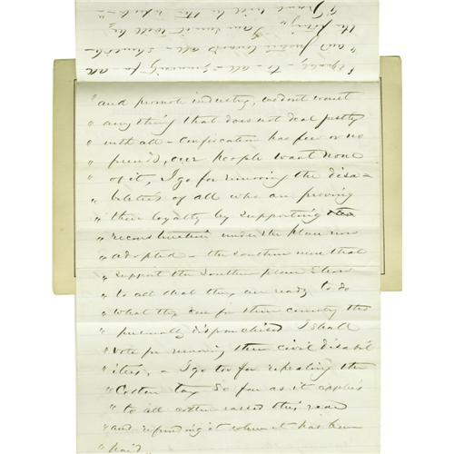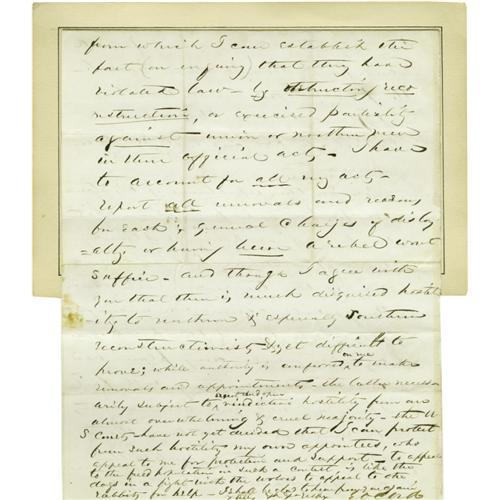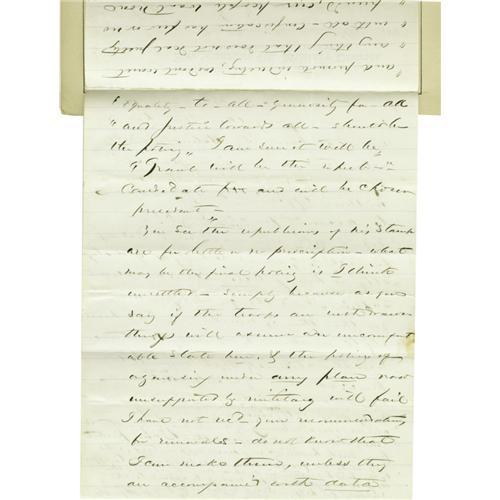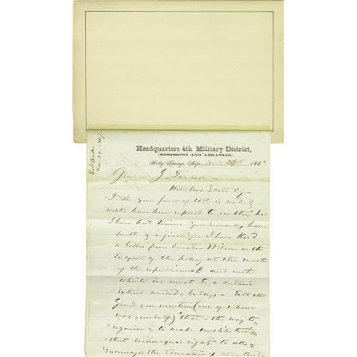 <B>E. O. C. Ord. Historically Important Autograph Letter Signed</B></I>: "<I>E. O. C. Ord/M Genl</B></I>", four full pages, front and verso. Headquarters 4th Military District, (Mississippi and Arkansas), Holly Springs, Miss., November 20, 1867. To Genl J Tarbell, Hillsboro Scott County Mississippi - In part: "<I>I have Recd a letter from Senator Henry Wilson of Massachusetts …he says - tell the Genls you mention (one of whom was yourself) 'that the way to organize is to make constitutions that secure equal rights to all, encourage the Education of all and promote industry, we don't want anything that does not deal justly with all - confiscation has few or no friends, our people want none of it, I go for removing the disabilities of all who are proving their loyalty by supporting reconstruction under the plan now adopted - the southern men that support the Southern plan show to all that they are ready to do what they can for their country tho personally disfranchised. I shall vote for removing their civil disabilities - I go too for repealing the Cotton tax so far as it applies to all cotton raised this year and refunding it when it has been paid. Equality to all - Generosity for all and Justice towards all should be the policy. I am sure it will be, Grant will be the repub candidate for and will be chosen president.' You can see the republicans of his stamp are for little or no prescription…as you say if the troops are withdrawn things will assume an uncomfortable state here…I have to account for all my acts - Report all removals and reasons for each; general charges of disloyalty or having been a rebel won't suffice and though I agree with you that there is much disguised hostility to northern & especially Southern reconstructionists, & yet difficult to prove…."</B></I> Affixed at top edge to another sheet.<BR><BR>Eight months earlier, Congress had passed over President Andrew Johnson's veto, an "Act to provide for the more efficient Government of the Rebel States." Ten former Confederate states were "divided into military districts and made subject to military authority of the United States." The 11th Confederate state, Tennessee, had ratified the 13th and 14th Amendments to the Constitution in 1866 and had been readmitted to the Union. Five military districts were formed. Mississippi and Arkansas constituted the 4th. General Edward Ortho Cresap Ord was given command of the 4th Military District. During the Civil War, General Ord commanded troops in the Western Frontier, Louisiana and the Shenandoah Valley. He was seriously wounded in 1862 and 1864, but returned to his command each time. After the Civil War, Ord had also commanded the Department of Arkansas, the Department of California, the Department of the Platte, and the Department of Texas.<BR><BR>In this letter, Massachusetts Senator Henry Wilson correctly predicted the nomination and election of General Ulysses S. Grant as President in 1868. He had supported the use of federal troops to enforce Congressional Reconstruction. In 1868, Wilson made an extended speaking tour throughout the southern states. Journalists thought he wanted to be President but, as this letter proves, Wilson supported Grant; he wanted to be Vice President. Speaking in the South, he felt certain that, to survive, the Republican Party must be biracial. He told a Black audience in New Orleans "I do not want to see a white man's party or a black man's party…While a black man is as good as a white man, a white man is as good as a black man. See to it that while you are striving to lift yourselves up, you do not strive to pull anyone else down." At the 1868 Republican National Convention, Southern delegates generally supported Wilson's candidacy. He finished second on the first ballot for the Vice Presidential nomination, eventually losing to Speaker of the House Schuyler Colfax. In 1872, however, Wilson was elected Grant's second term Vice President, in the first presidential election held after the Civil War with all Confederate states readmitted. Accompanied by an engraved portrait of Ord.<BR><BR><b>Shipping:</b> Small Flat (<a target="_blank" href="http://www.heritageauctions.com/common/shipping.php">view shipping information</a>)