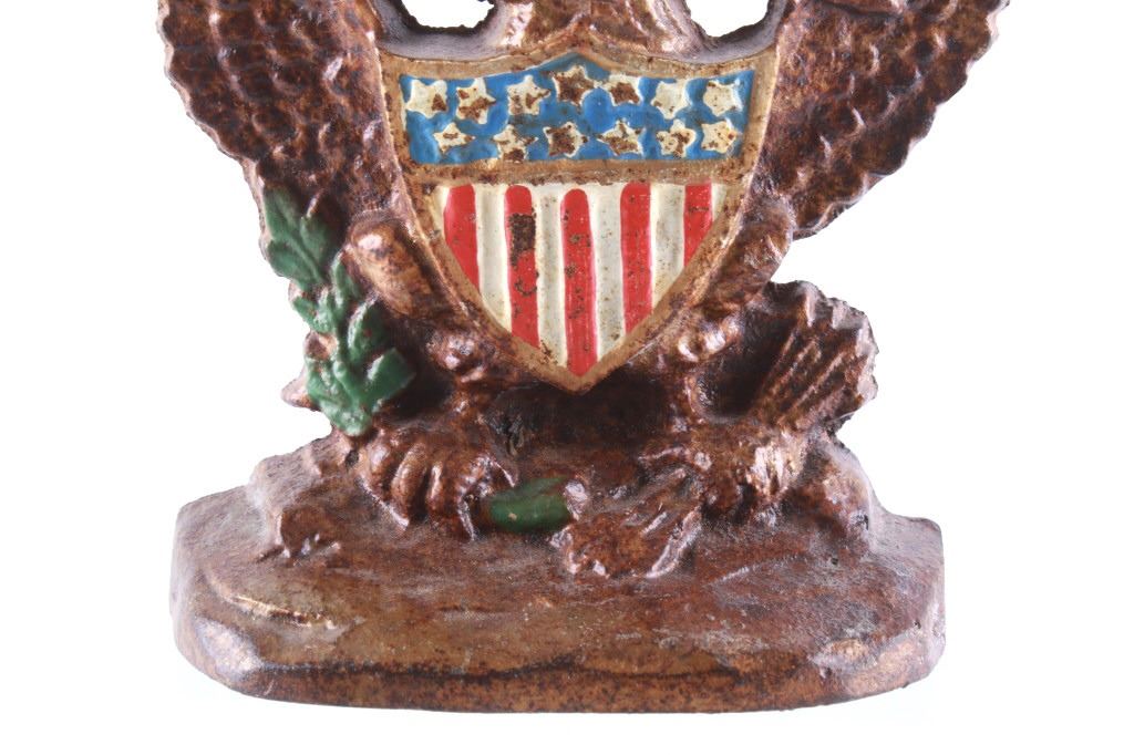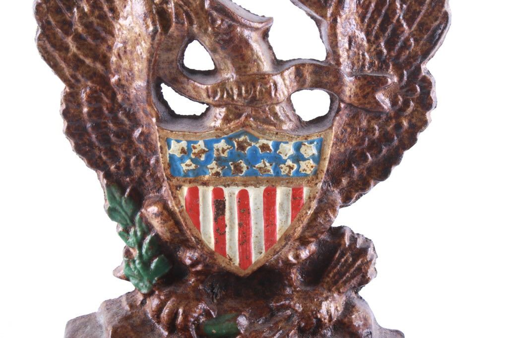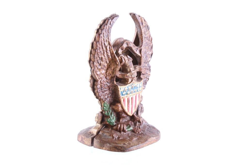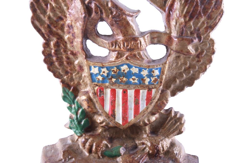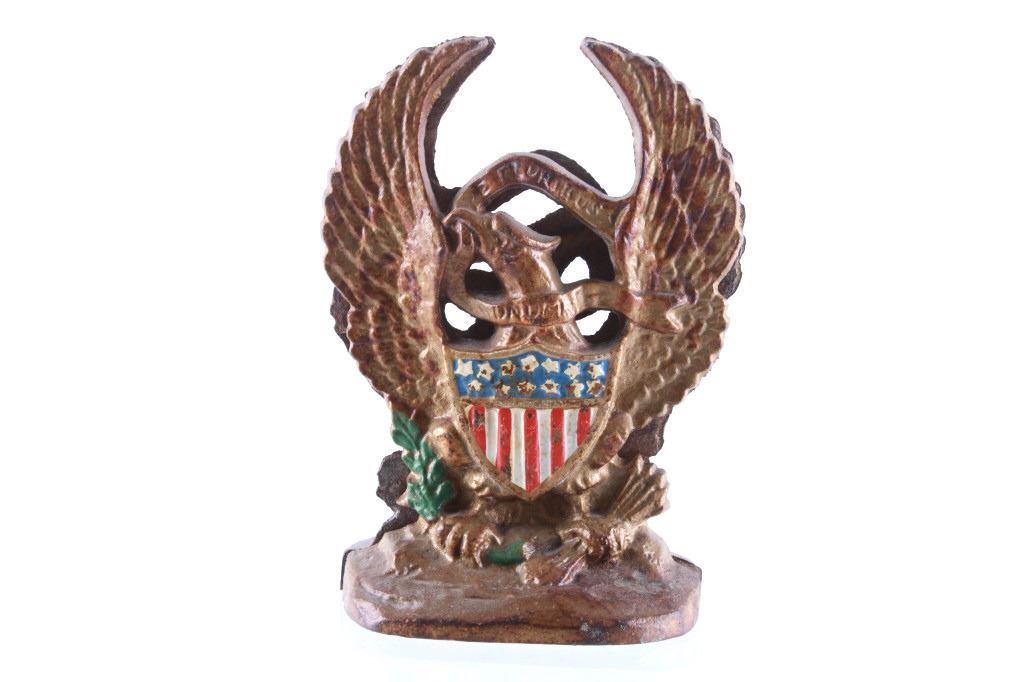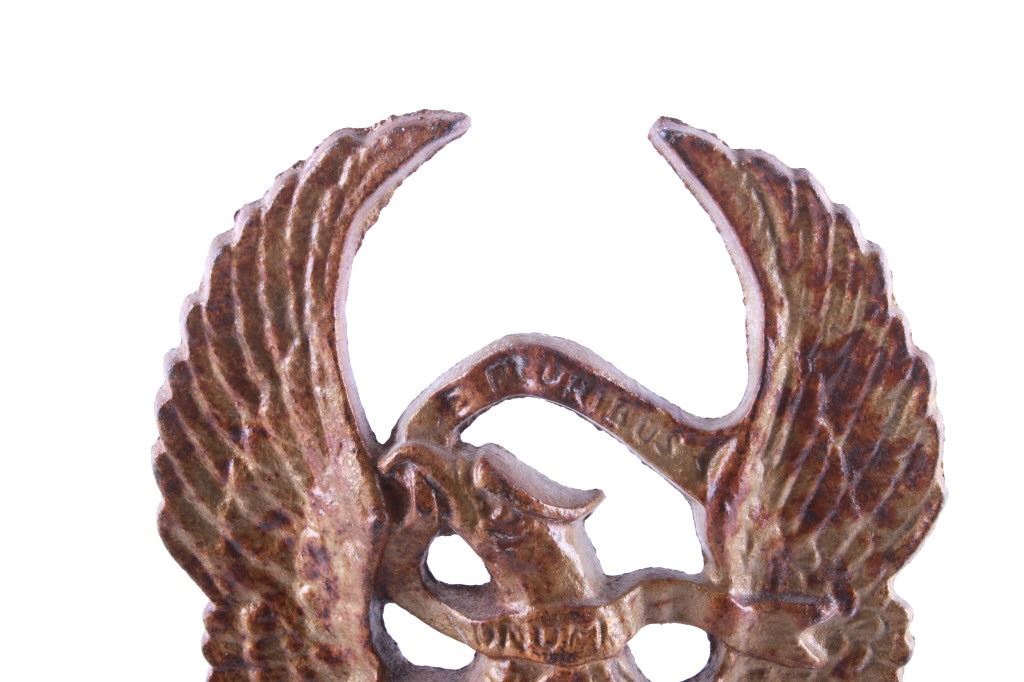 Featured in this lot is this E. Pluribus Unum American eagle and crest bookend's. The bookends feature American eagles with a ribbon that reads E. Pluribus Unum and shows the classic arrows and olive branch, and also shows a crest or shield with the American flag seen on it. The condition of this of this of this pair of bookends is fair with oxidation shown on the along the outside and the and backside of the bookends, also to the base of the of the bookends. The measurements of the bookends are 7" x 5" x 1 3/4.