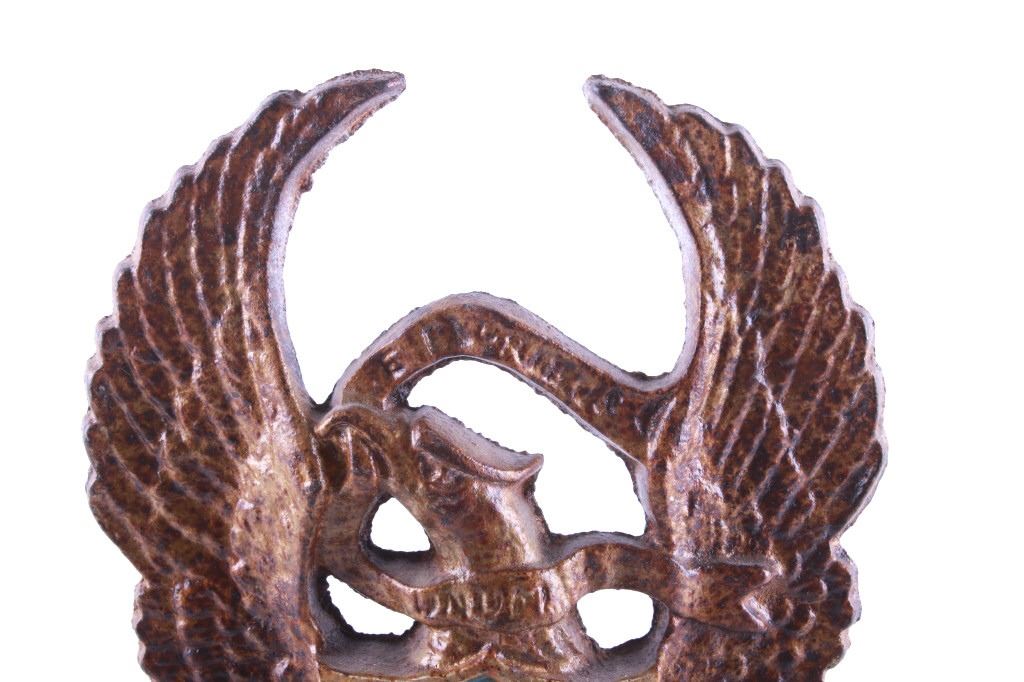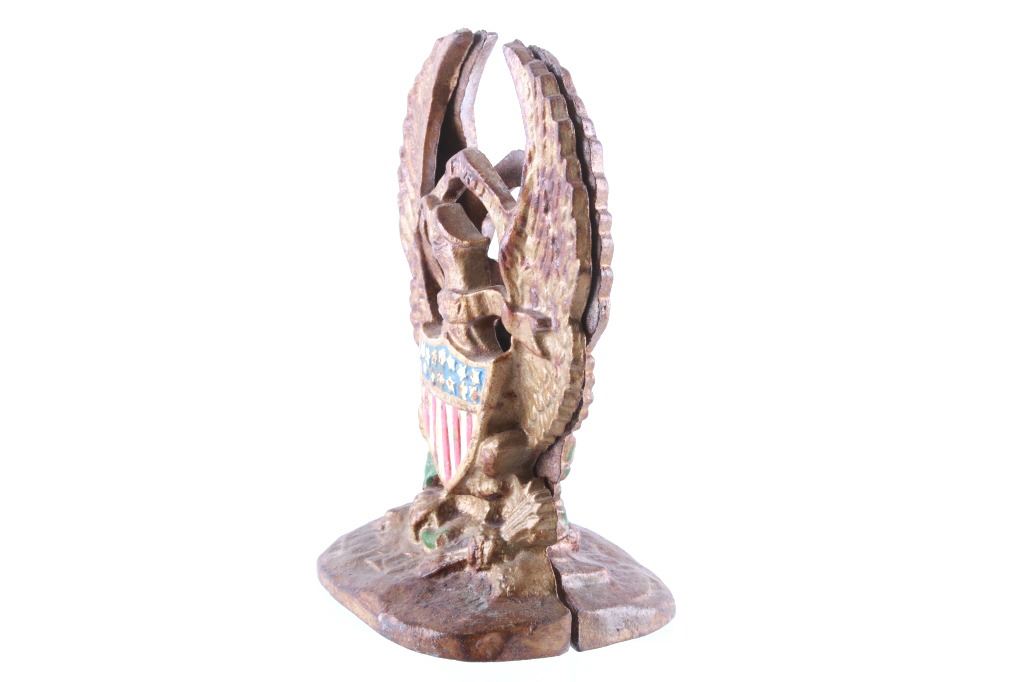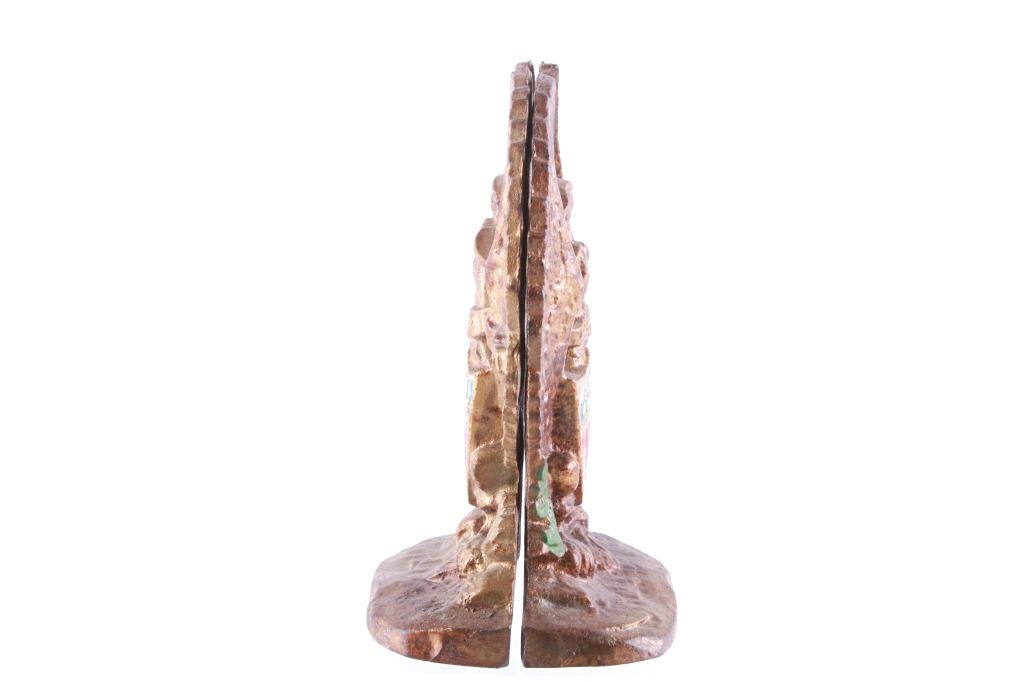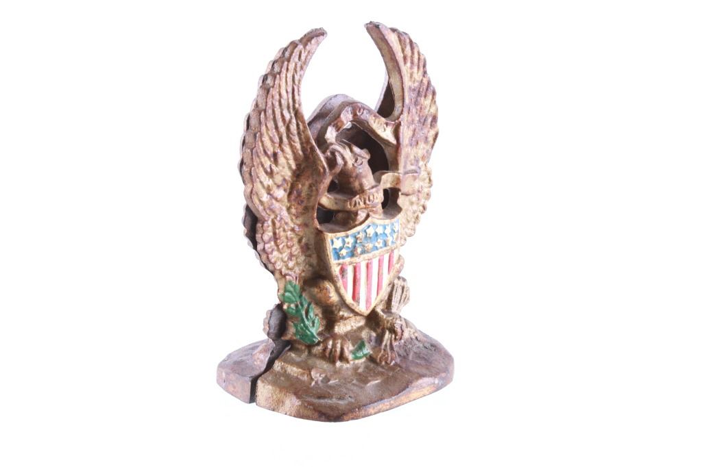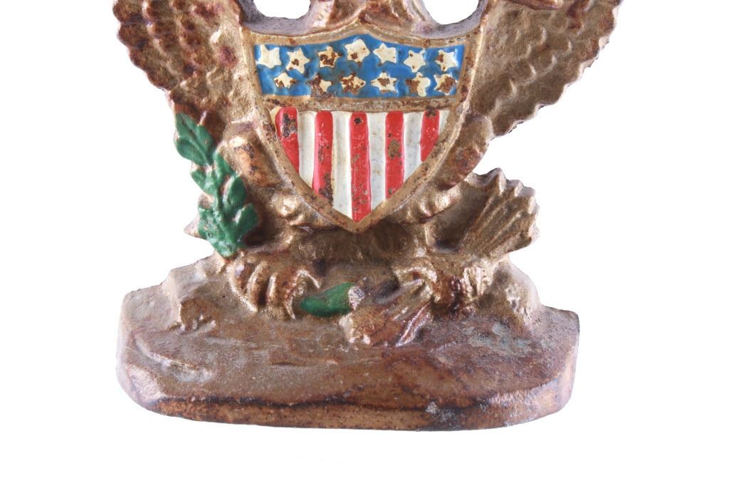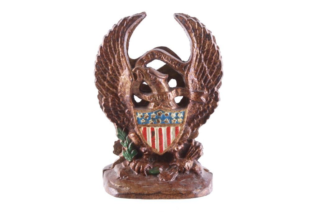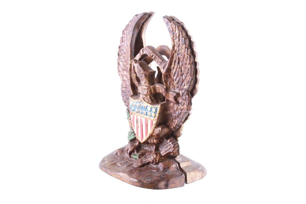 Featured in this lot is this E. Pluribus Unum American eagle and crest bookend's. The bookends feature American eagles with a ribbon that reads E. Pluribus Unum and shows the classic arrows and olive branch, and also shows a crest or shield with the American flag seen on it. The condition of this of this of this pair of bookends is fair with oxidation shown on the along the outside and the and backside of the bookends, also to the base of the of the bookends. The measurements of the bookends are 7" x 5" x 1 3/4.