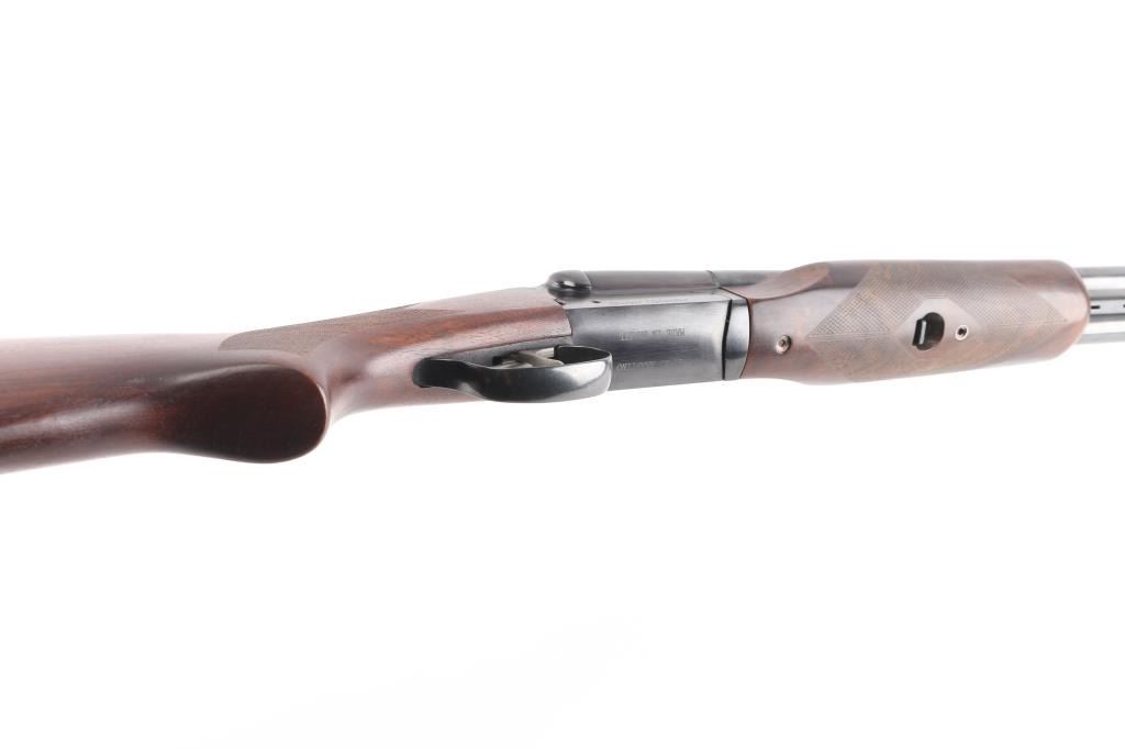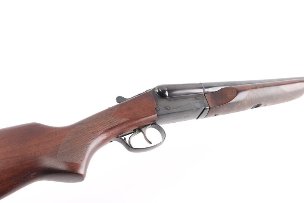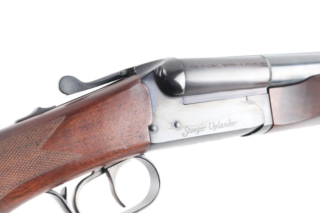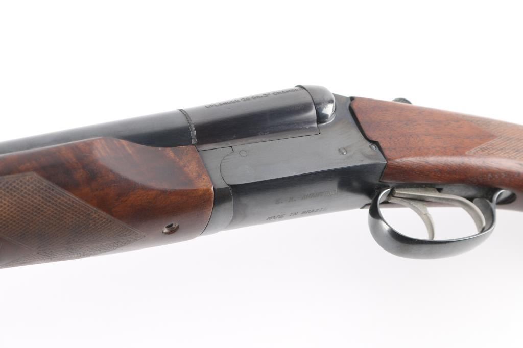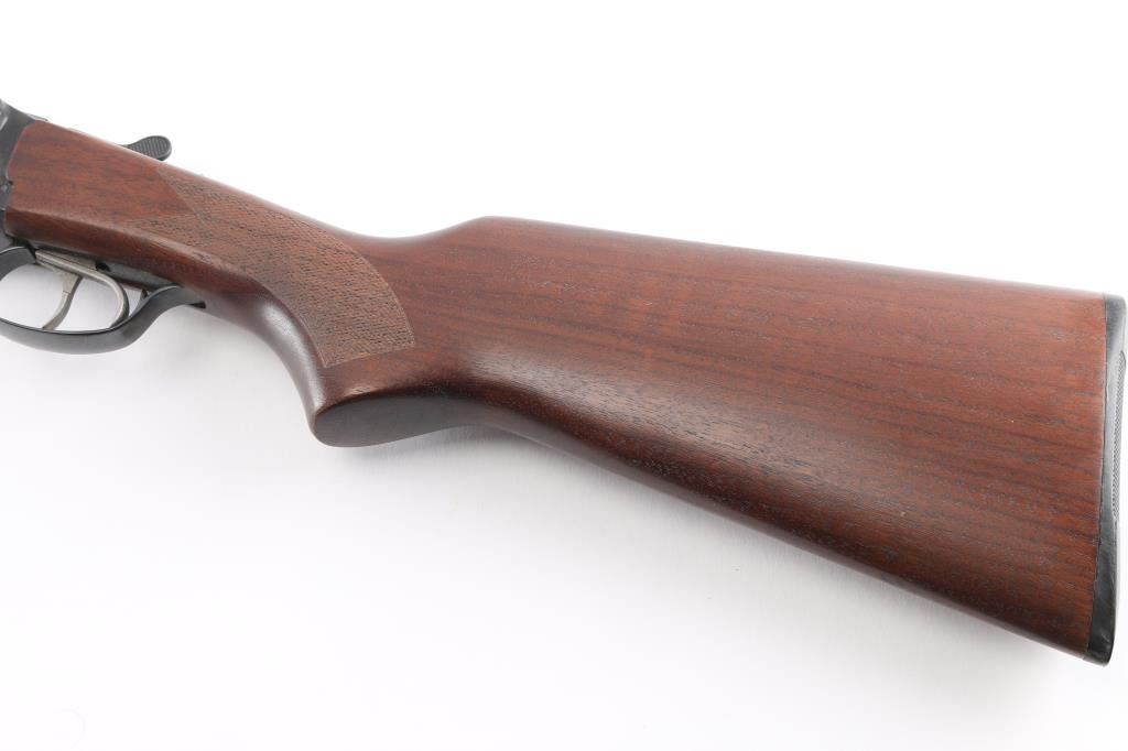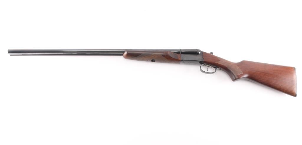 Sn: C672527-12. Double barreled side-by-side shotgun made in Brazil by E.R. Amantino (also known as Boito), imported by Stoeger. Features box lock, blued finish, 26" barrels with choke tubes (Full(L) & M (R) installed), low matted rib, brass bead front sight, double triggers, knurled top lever, sliding tang safety, extractor, checkered walnut beavertail forend, checkered walnut semi-pistol grip shoulder stock, black plastic butt plate. Accepts 2-3/4" & 3" shells. LOP is 14.1/2". Barrels numbered to receiver. Bores are very good. Retains 95% finish with minor edge losses, handling marks. Wood is excellent with few blemishes.Condition is NRA Excellent. Modern Firearm.