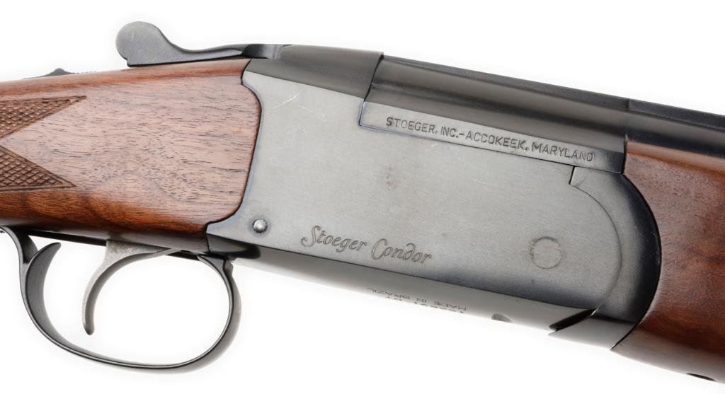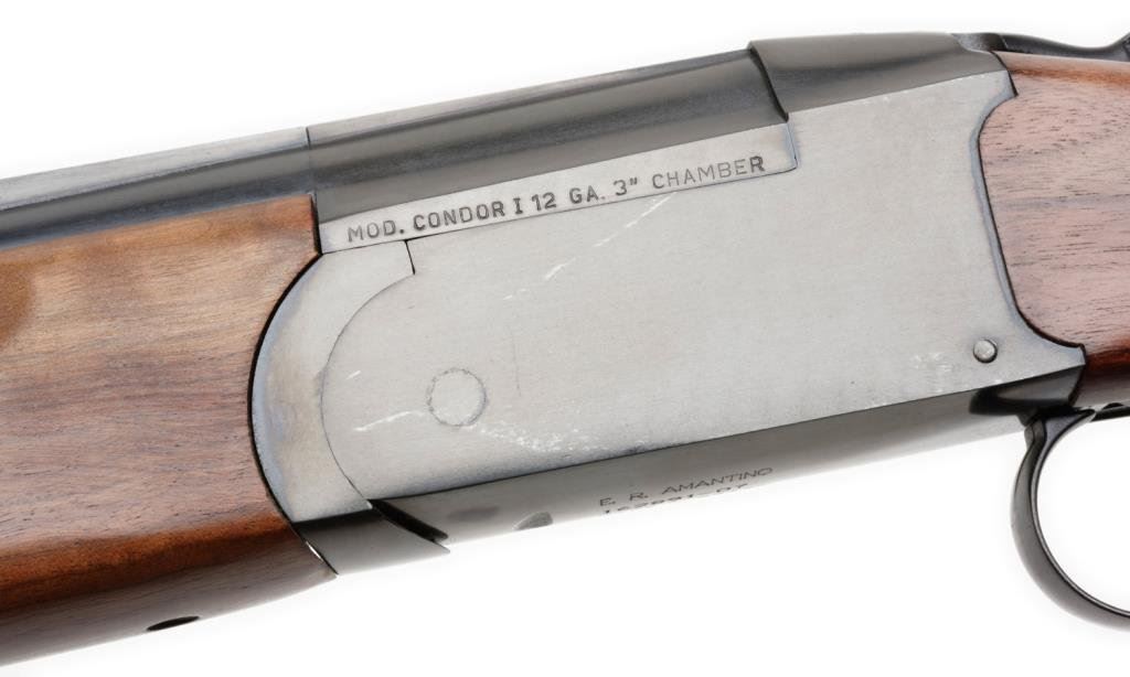 *E.R. Amantino, for Stoeger, Inc. Condor Model over/under shotgun, 12 gauge, 28” ventilated rib barrels, green glow front sight, S/N 162891-07, black finish, checkered wood stocks with added woven shell holder on butt stock; in overall excellent condition showing little use. Est.: $350-$700.