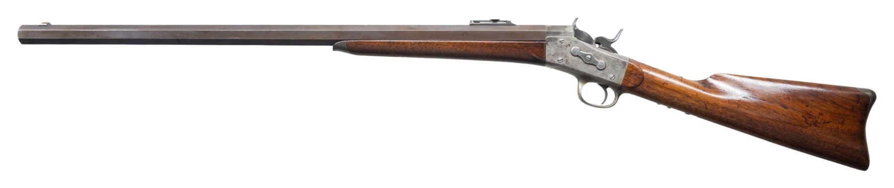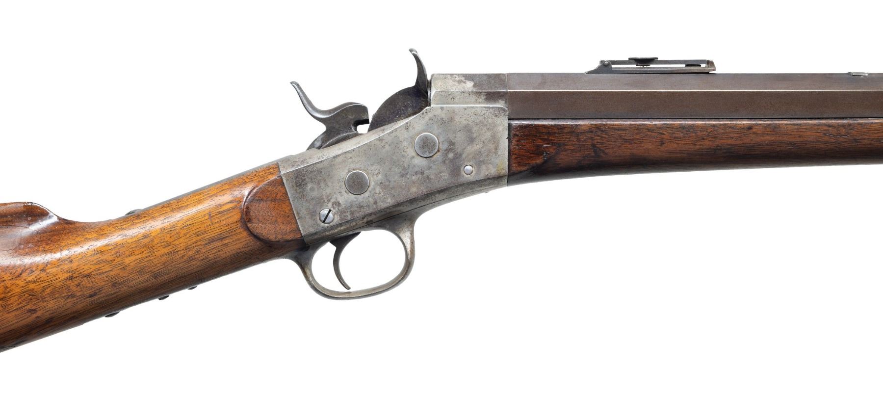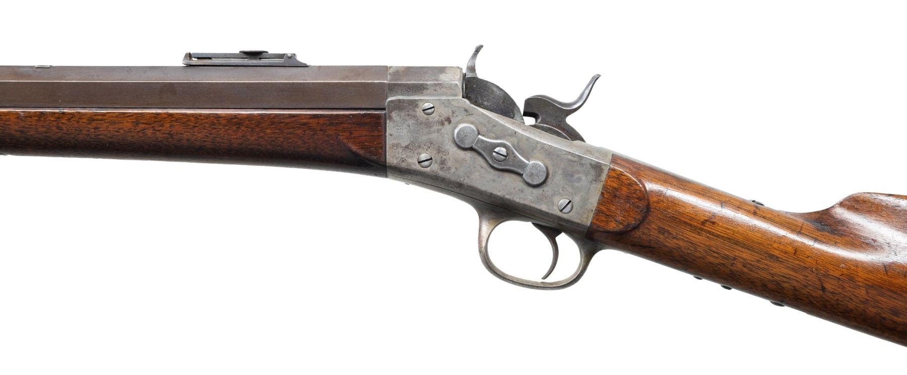 Cal. 44-77. S# 3995). Matching numbered 28" oct. barrel with cal. marking "44 S". German silver blade front sight, filler in previous rear sight dovetail & added aperture ladder rear sight (that was added over barrel markings. Smooth walnut stock set w/ metal forearm tip & curved steel buttplate. CONDITION: balance of barrel has brown patina mixed with fair blue showing scattered edge marks. Lightly sanded & refinished wood shows previous smoothed over gouges with numerous dings & marks. Shiny bore shows very good rifling near muzzle with to rifling forward of chamber. PROVENANCE: The Esteemed Norm Greenberg Collection. (01-27757/MD). ANTIQUE. $1,000-1,500.