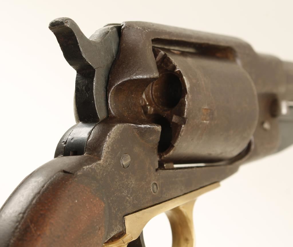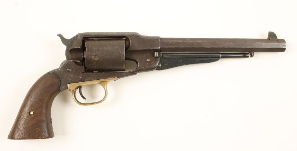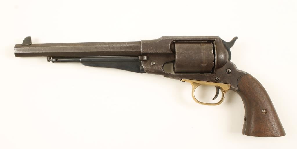 SN: 140866 Blued single-action 5-shot revolver with an 8" octagon barrel. A conversion from percussion to cartridge ammunition utilizing the Rollin White patent. Loading lever is a modern replacement. Bluing has turned to a brown patina with dings, surface rust and scratches. Brass trigger guard is not original. Trigger may be new production. Bore is dark with strong rifling, pitting and a ring. Chambers are dark with pitting. Front sight is a later addition. Action works with light trigger. Condition is poor. *Antique Firearm*