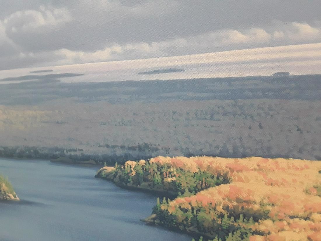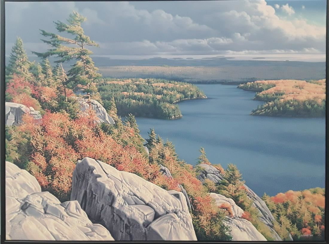 E. Robert Ross's "Above George Lake" original acrylic on canvas. This piece is depicting a view from atop a mountain looking out onto the horizon, overlooking George Lake. This has been professionally custom framed in floater frame.