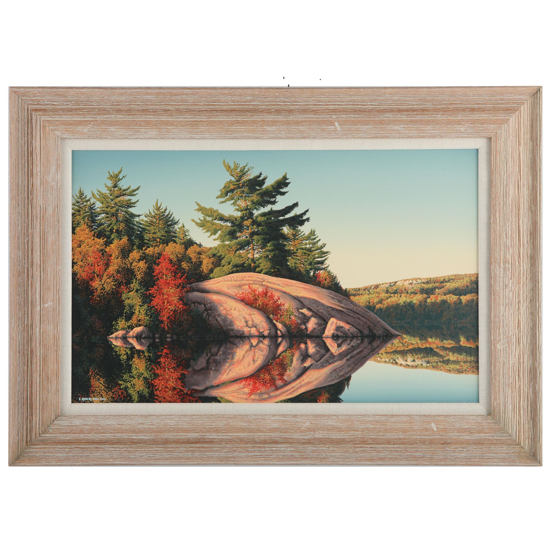 E. Robert Ross's "Reflections" Original Acrylic painted on Hardboard. Reflections is in George Lake, Killarney Park, Ontario. This piece is beautifully framed, Circa 2002. Image - 17" x 26". Frame - 24" x 34".