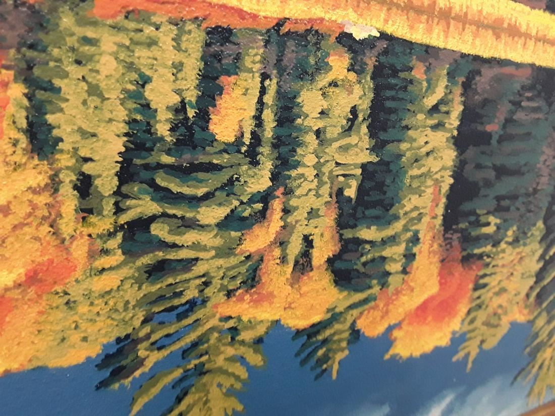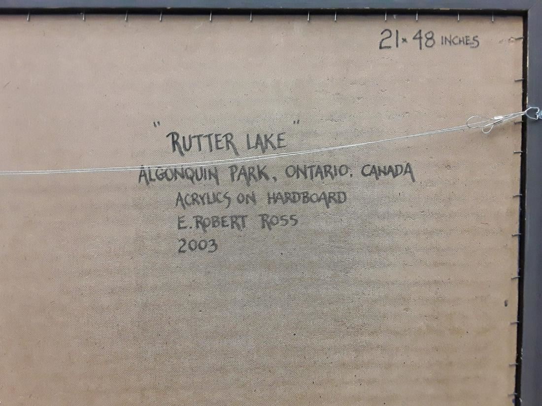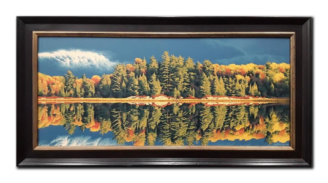 E. Robert Ross's "Rutter Lake" original acrylic on masonite painting, depicting Rutter Lake at Algonquin National Park in Ontario, Canada. The painting is of a beautiful treeline along the edge of a shoreline on the water, with the trees' reflection a major component of the piece. Ross has captured a beautiful scene at the time of year the leaves are just starting to change to their autumn colours. This piece has been professionally custom framed.