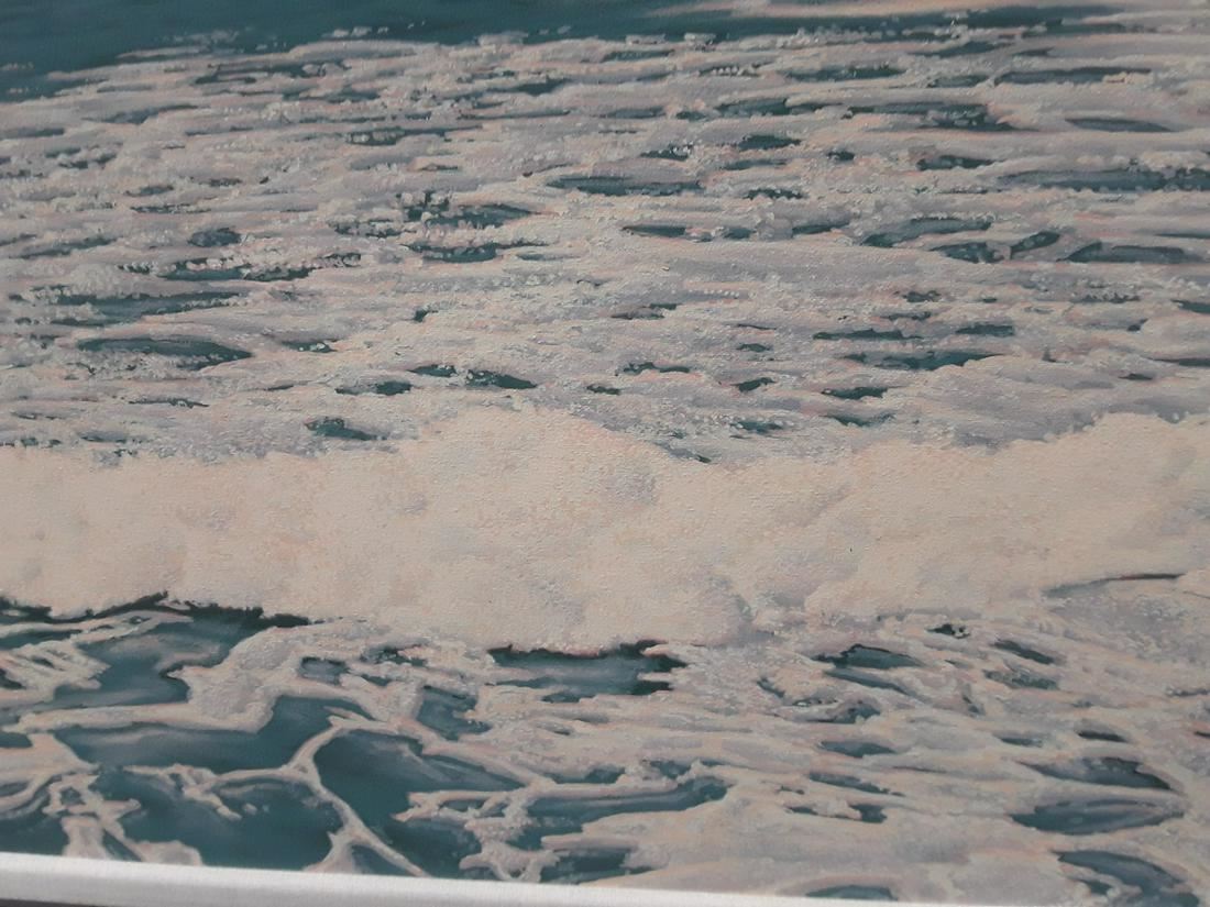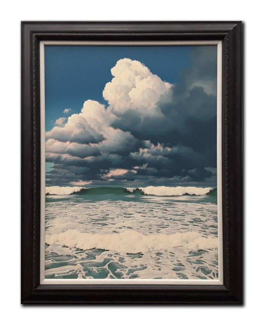 E. Robert Ross's "Storm Clouds and Breaking Waves" original acrylic on canvas. This piece is depicting waves rolling onto the beach, and in the background there are storm clouds glooming. This has been professionally custom framed with an inner frame liner.