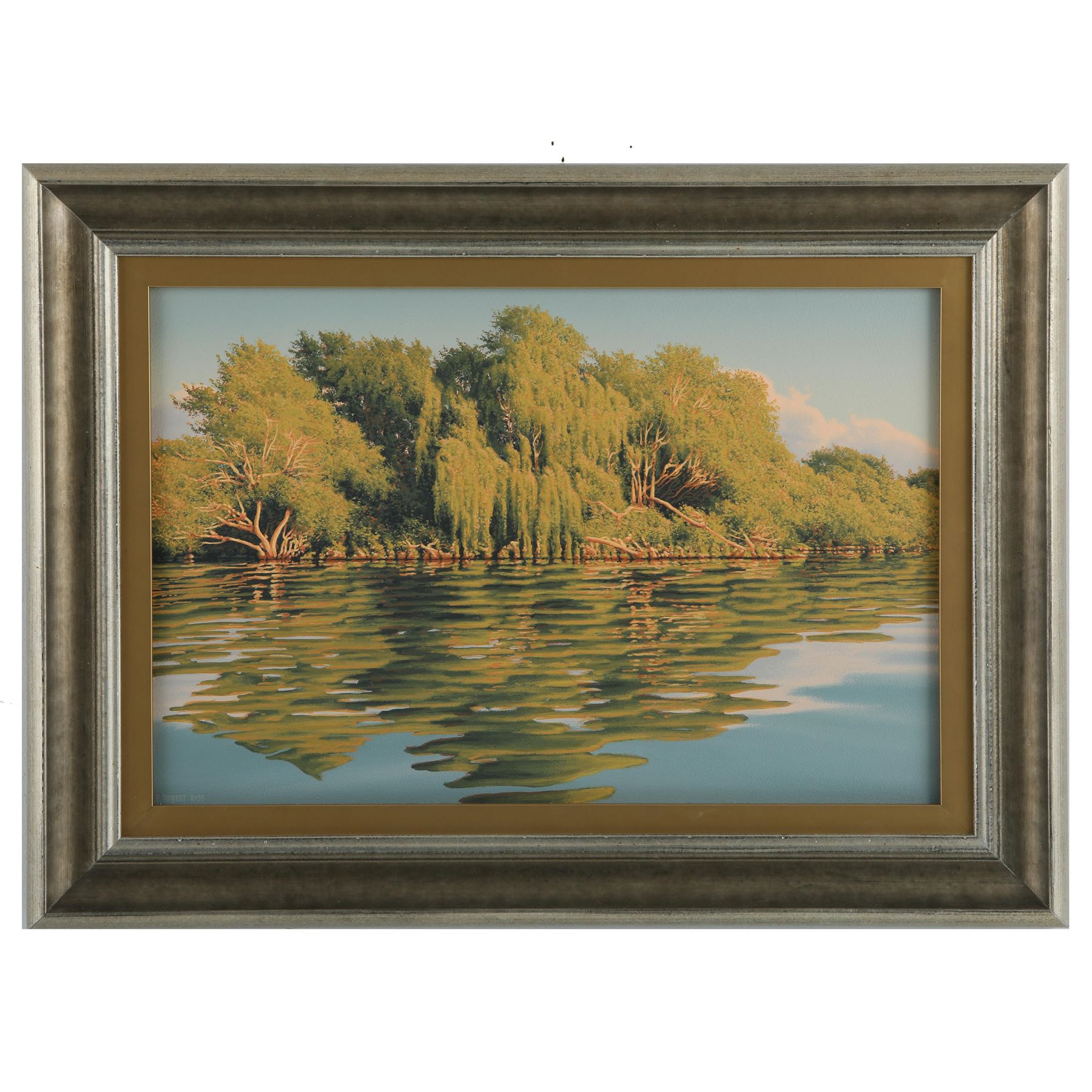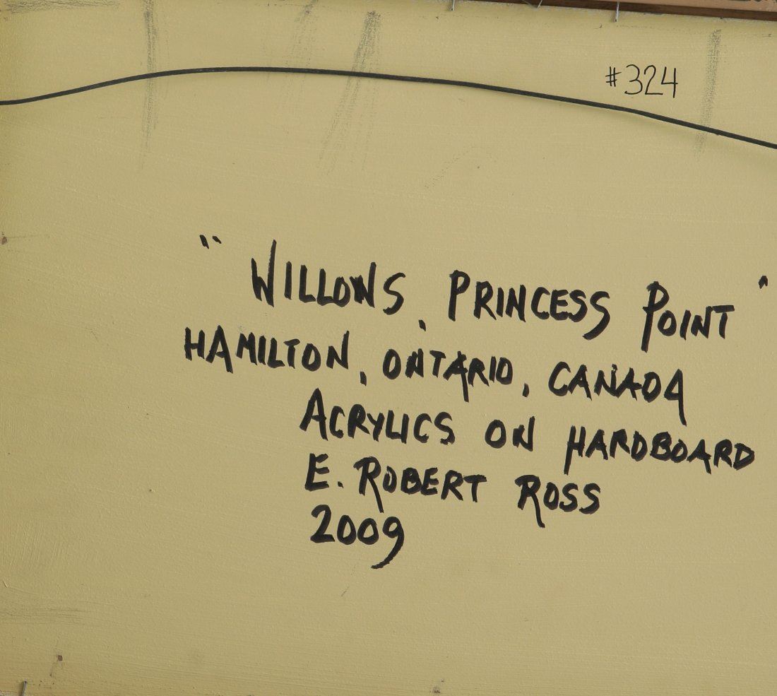 E. Robert Ross's "Willows Princess Point" Original Acrylics Framed on Hardboard. Willows Princess Point is in Hamilton, Ontario, Canada. This piece has been beautifully custom framed, and is in excellent condition. Circa 2009. Image- 24" x 16". Frame -31" x 23".