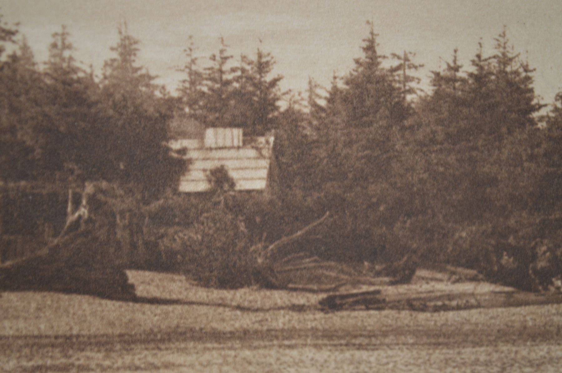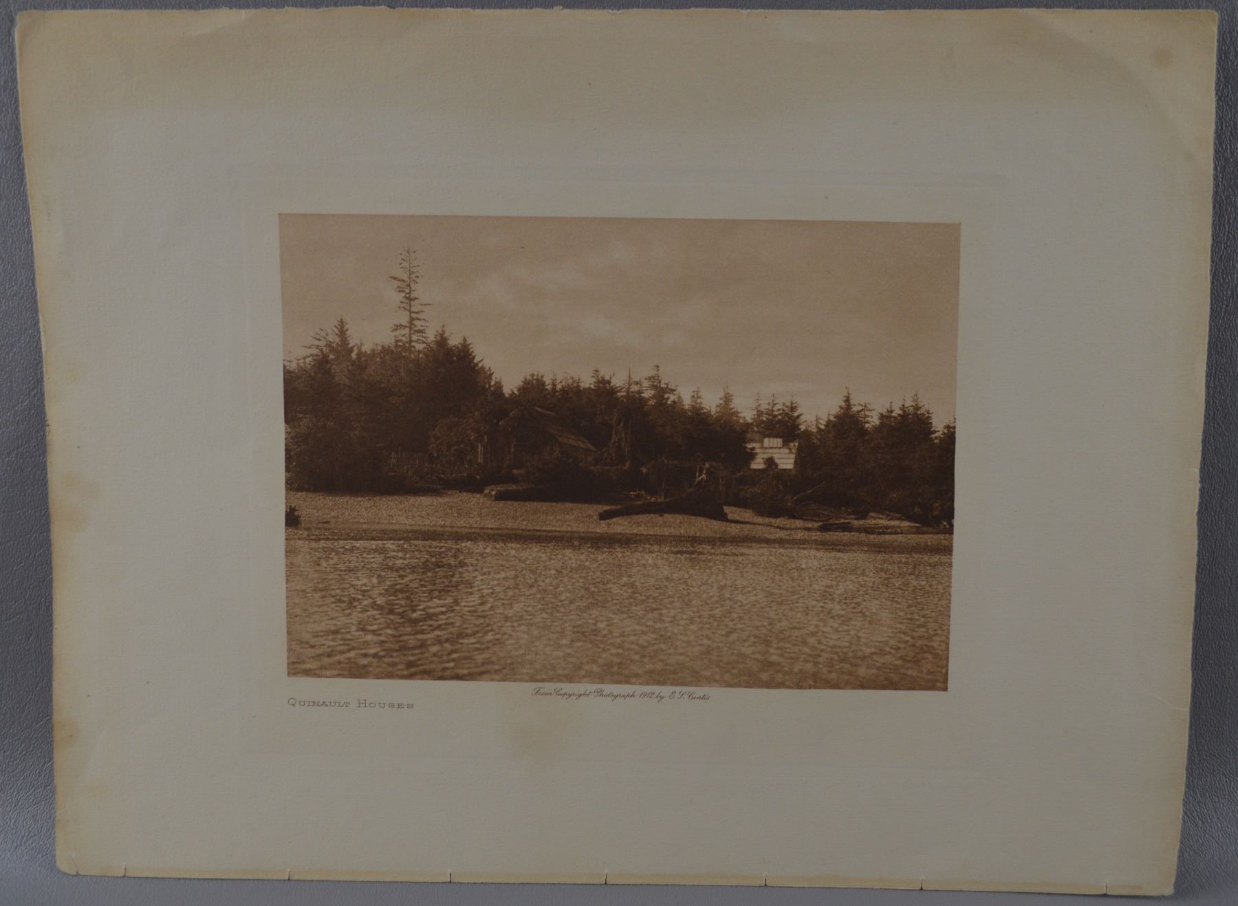 From copyright photograph 1912 by E.S. Curtis. Titled "Quinault Houses". Has acid burn.