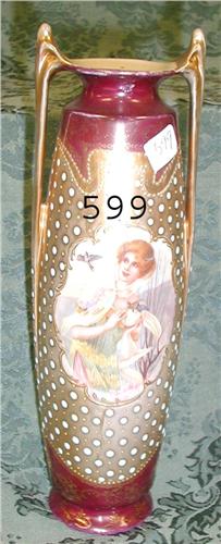 E.S. Prove Saxe 9 ¾” 2-handled vase with Victorian lady with swallows on a gold background – blue enamel beading with a maroon base and top. Some gold wear.