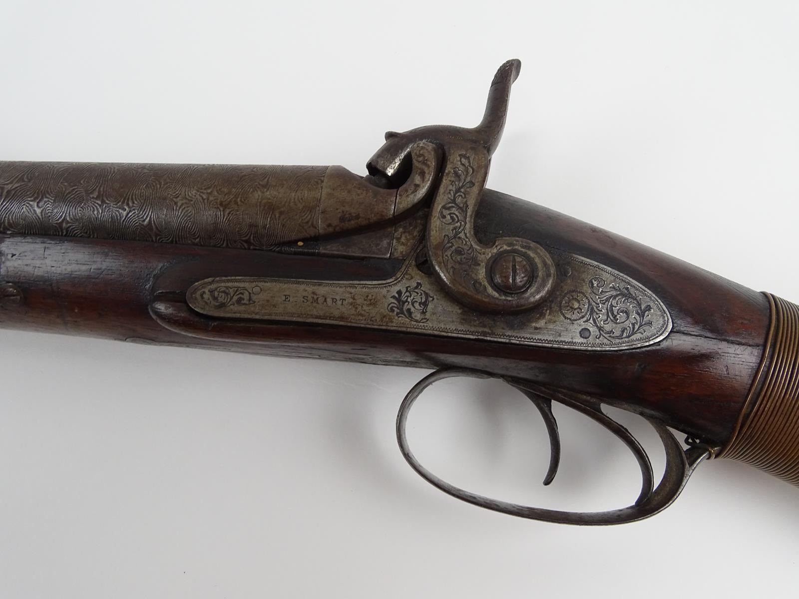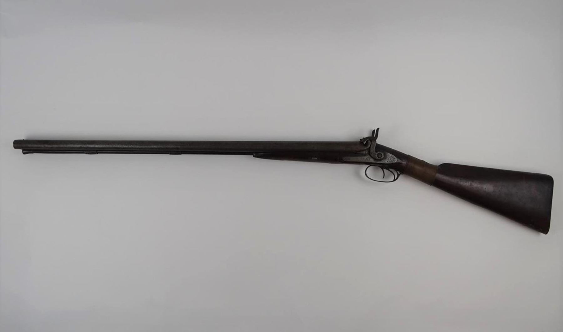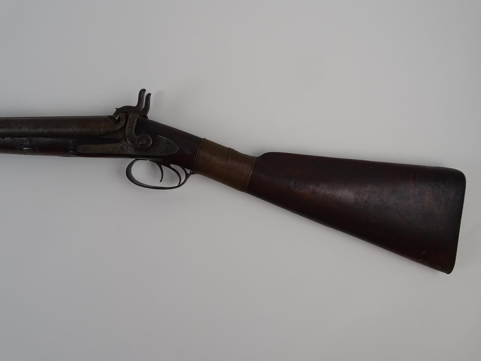 12 GA., PERCUSSION CAP HAVING ENGRAVED BARRELS AND HAMMERS. REPAIRED STOCK.