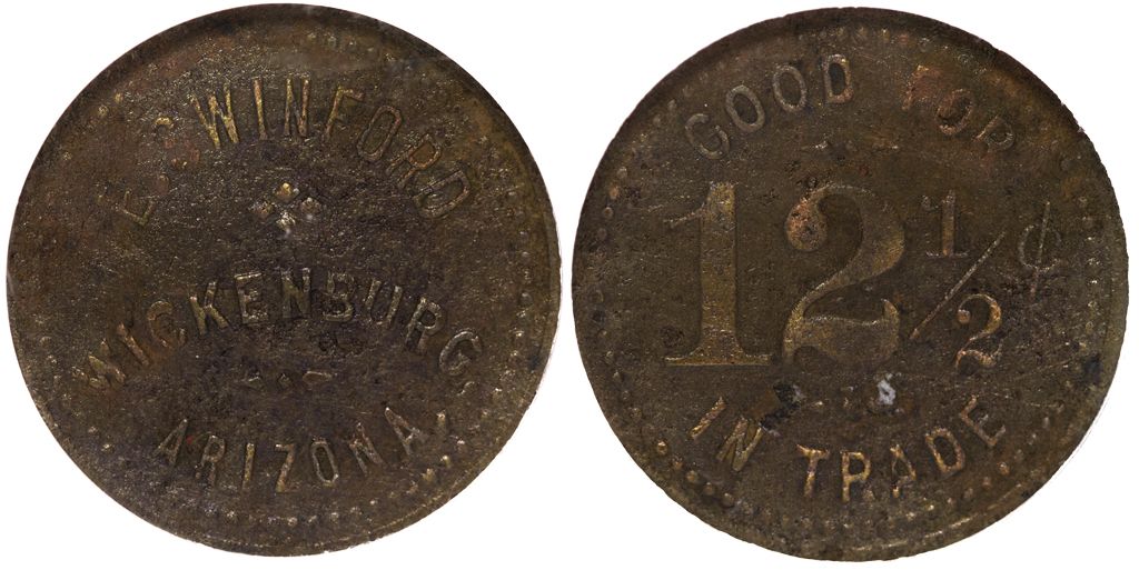 Round brass token, obv.: "Good for/ 12 1/2 c/ In Trade" rev.: "E. Swinford/ Wckensburg/ Arizona". Slabbed by NCS, certified genuine. Serial # 5207725-018 . R10.City: WickensburgCounty: Maricopa State: AZDate: c1908