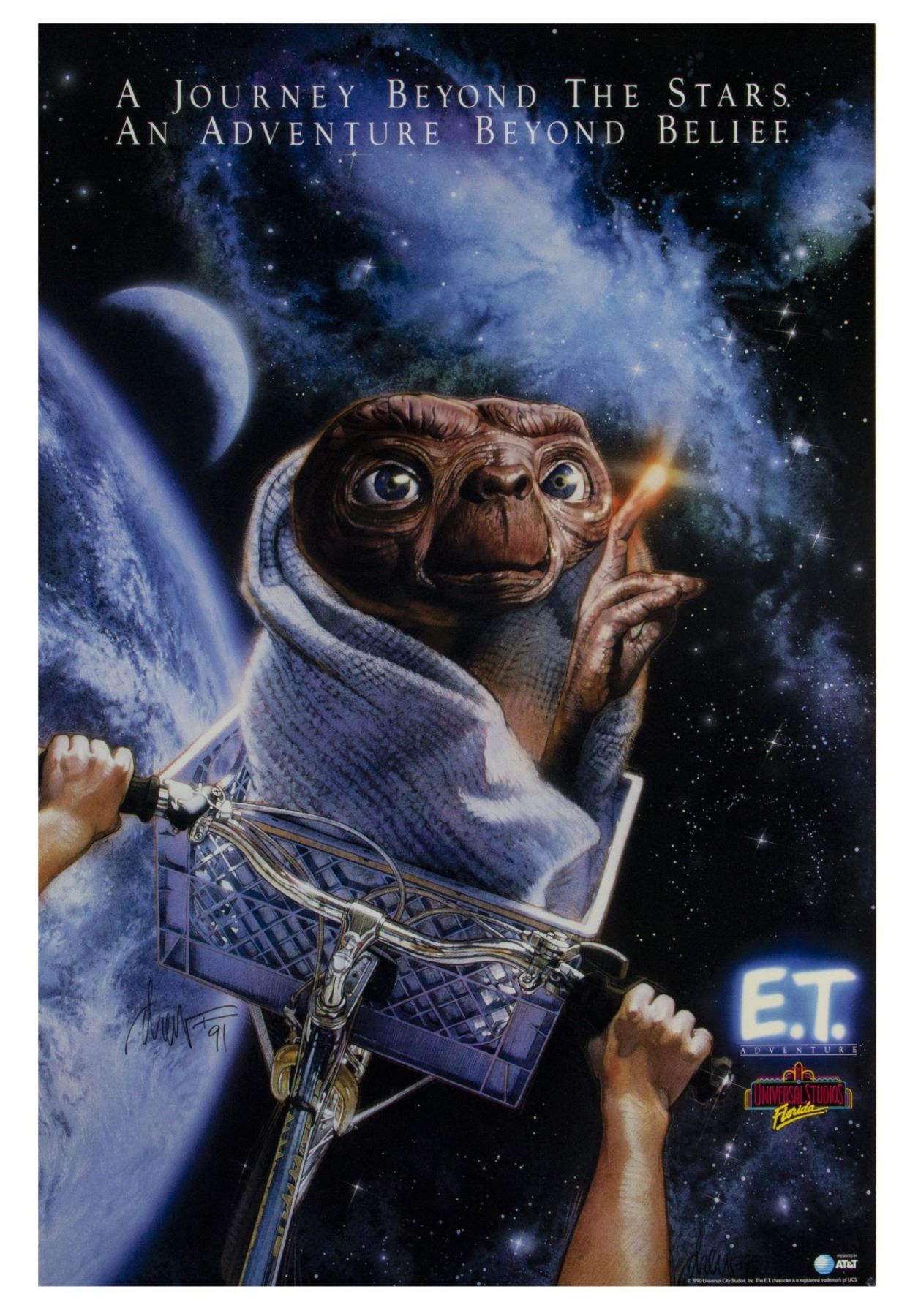 (Universal, 1990) A promotional poster created for the dark ride at Universal Studios Florida "E.T. Adventure". The poster features beautiful artwork by poster artist Drew Struzan, who signed this poster in felt pen "Drew 91" on the left side. Measuring 36"x24", the poster is in very good condition with a few minor creases and some edge wear.