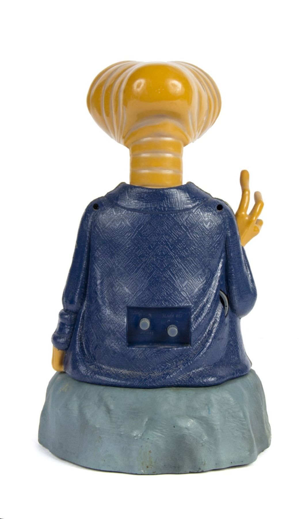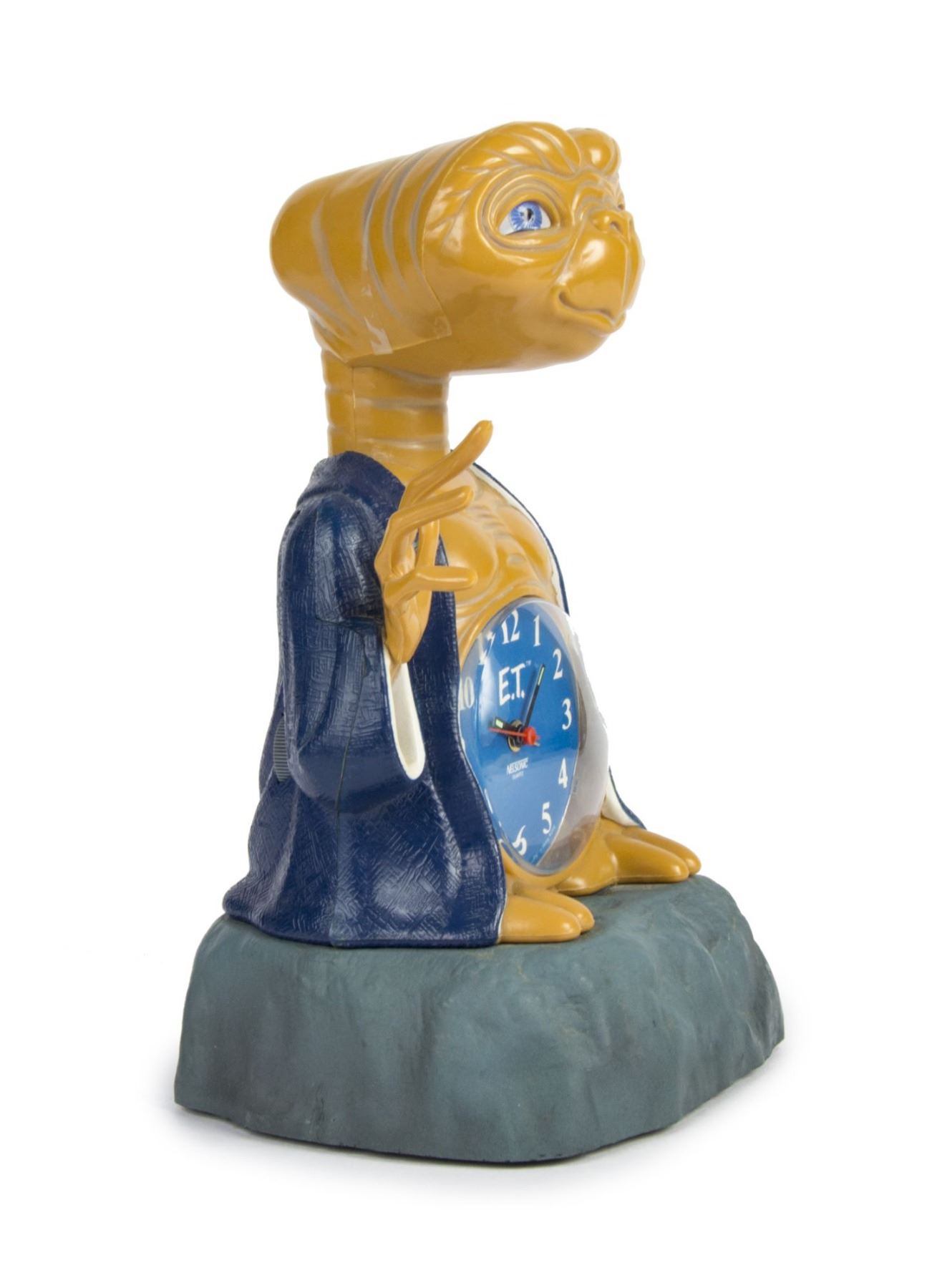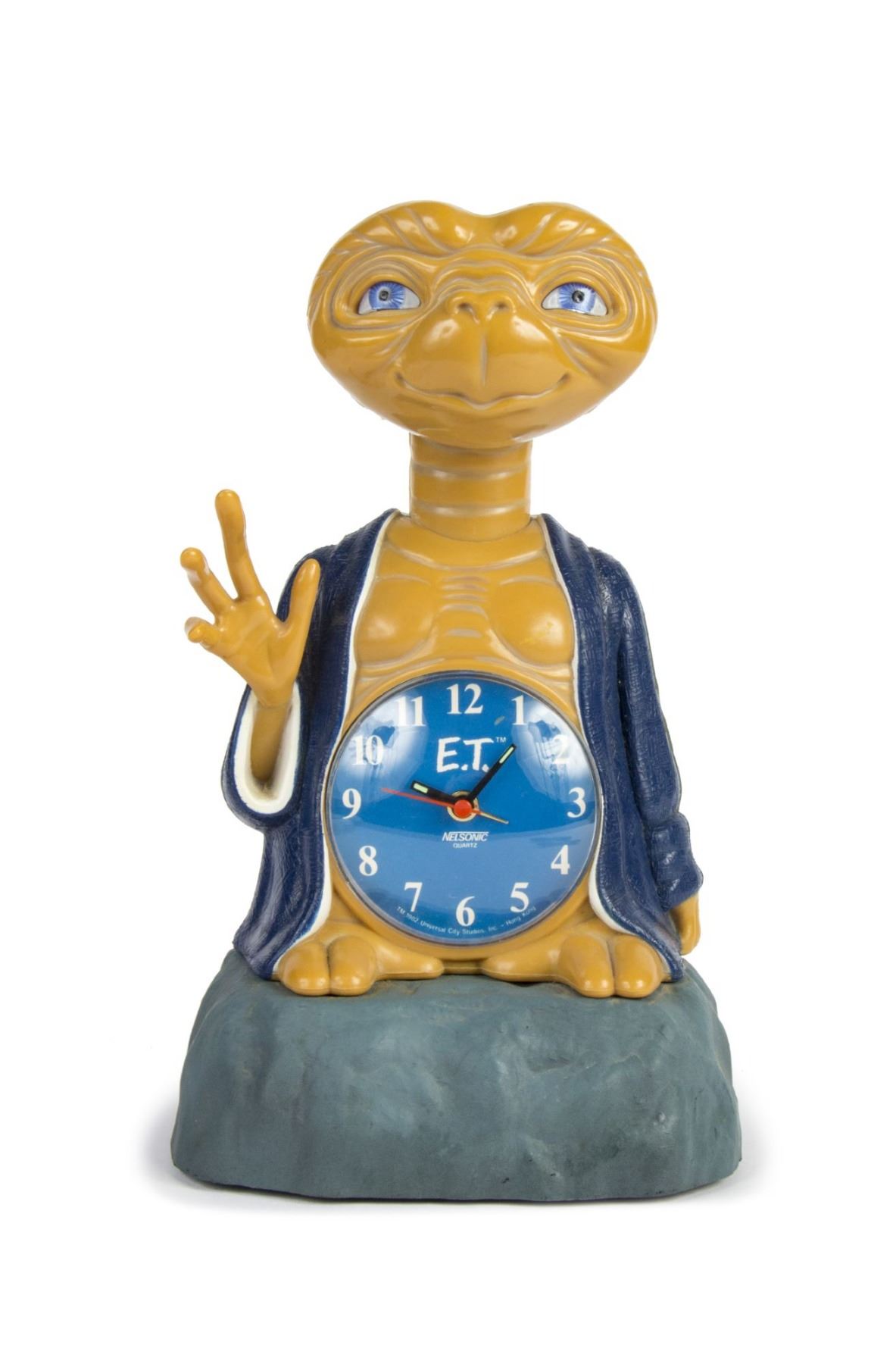 (Universal, 1982) Created by Nelsonic, this "E.T." shaped clock is battery operated and beautifully recreates the character. The clock's hands can still be manually adjusted but battery functionality has not been tested. The clock takes two D-batteries, and some corrosion has occurred in the battery compartment. The clock measures 10" tall, and the condition is good overall with some expected scuffs and scratches from use.