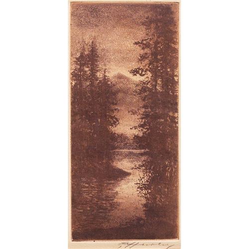 Unusual E.T.Hurley etching, scene with trees, body of water and mountains in the distance, signed, matted and nicely framed,3.5in. x 7.5in.