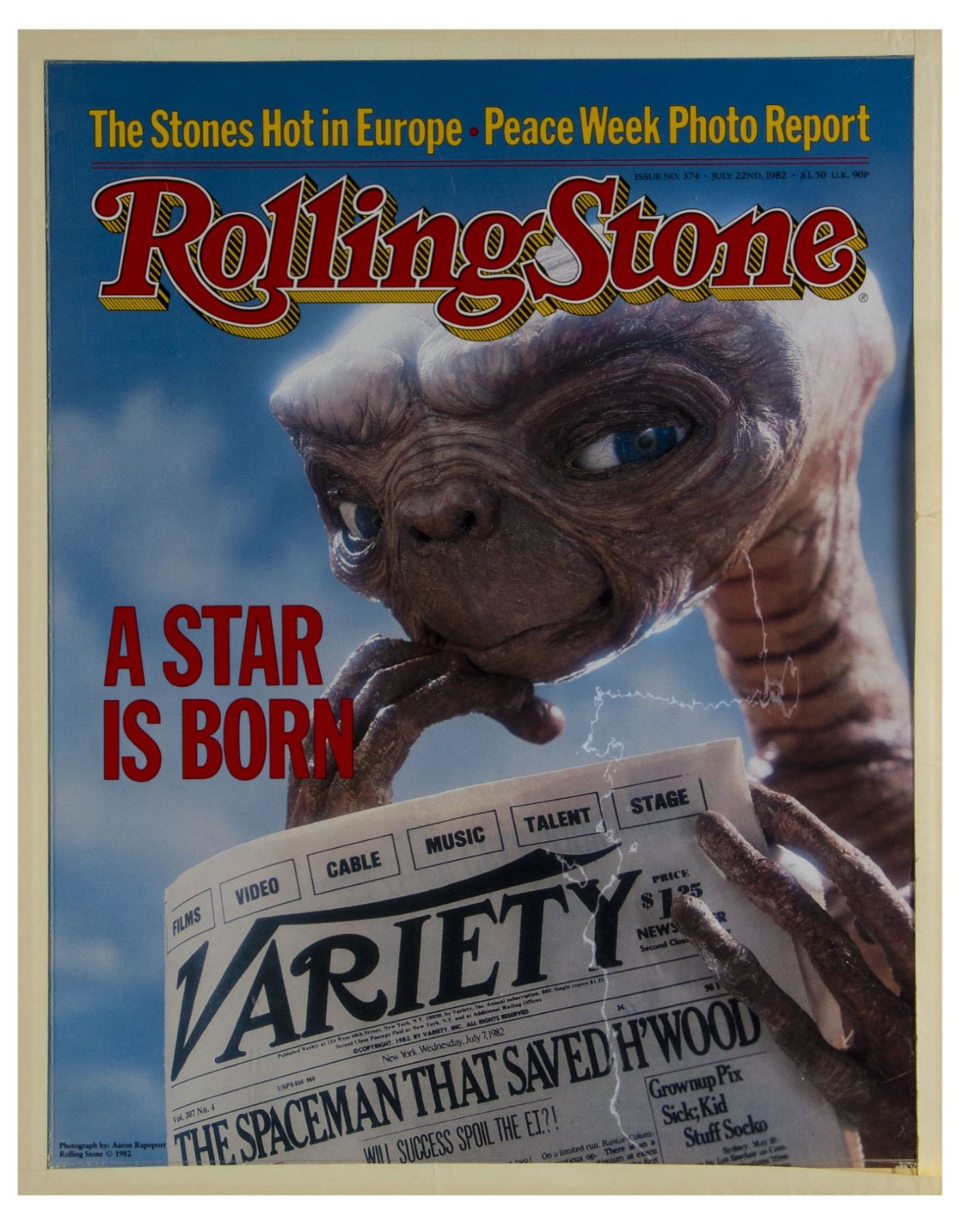 (Universal, 1982) An oversized display print for the July 1982 cover of "Rolling Stone" issue no. 374, featuring "E.T. the Extra-Terrestial". According to Bill Wallen, who designed promotional and advertising campaigns for the film, this print was used as a backdrop during the promotion of the film for interviews and set decoration. Images of this size and construction would travel with actors and with Director Steven Speilberg for interviews, and this print features great large imagery of E.T. The printed image is adhered to a board backing, with a clear protective sheet taped over the front. The artwork has an image size of 21.75"x17.25" on its 27.75"x23.5" board and the condition is good overall with some wear to the board.